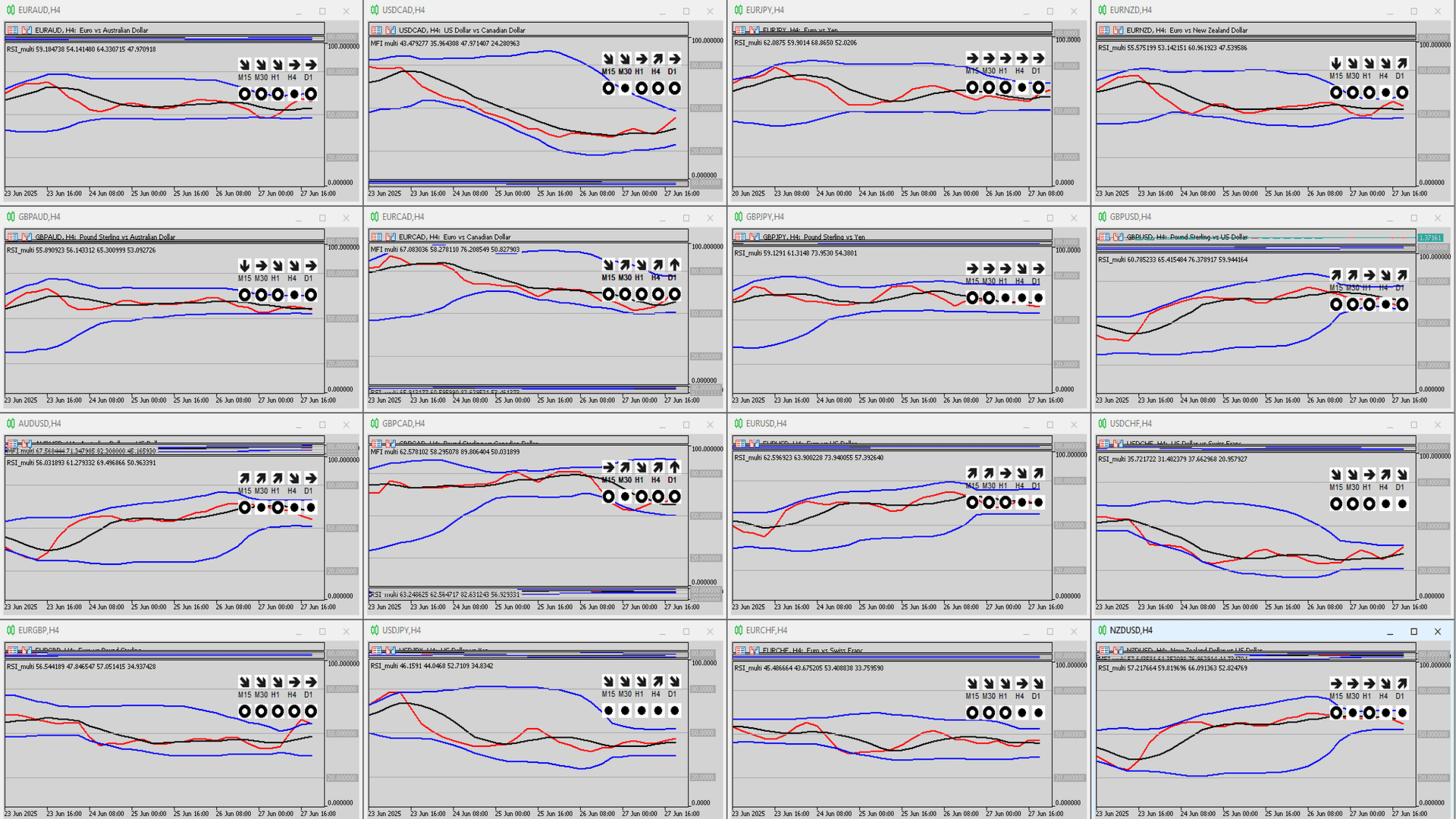 RSI-MULTI is a powerful monitoring tool based on the Money Flow Index (MFI), specifically designed for swing traders. It allows you to analyze trend direction and volatility across multiple timeframes simultaneously, without switching between charts.
