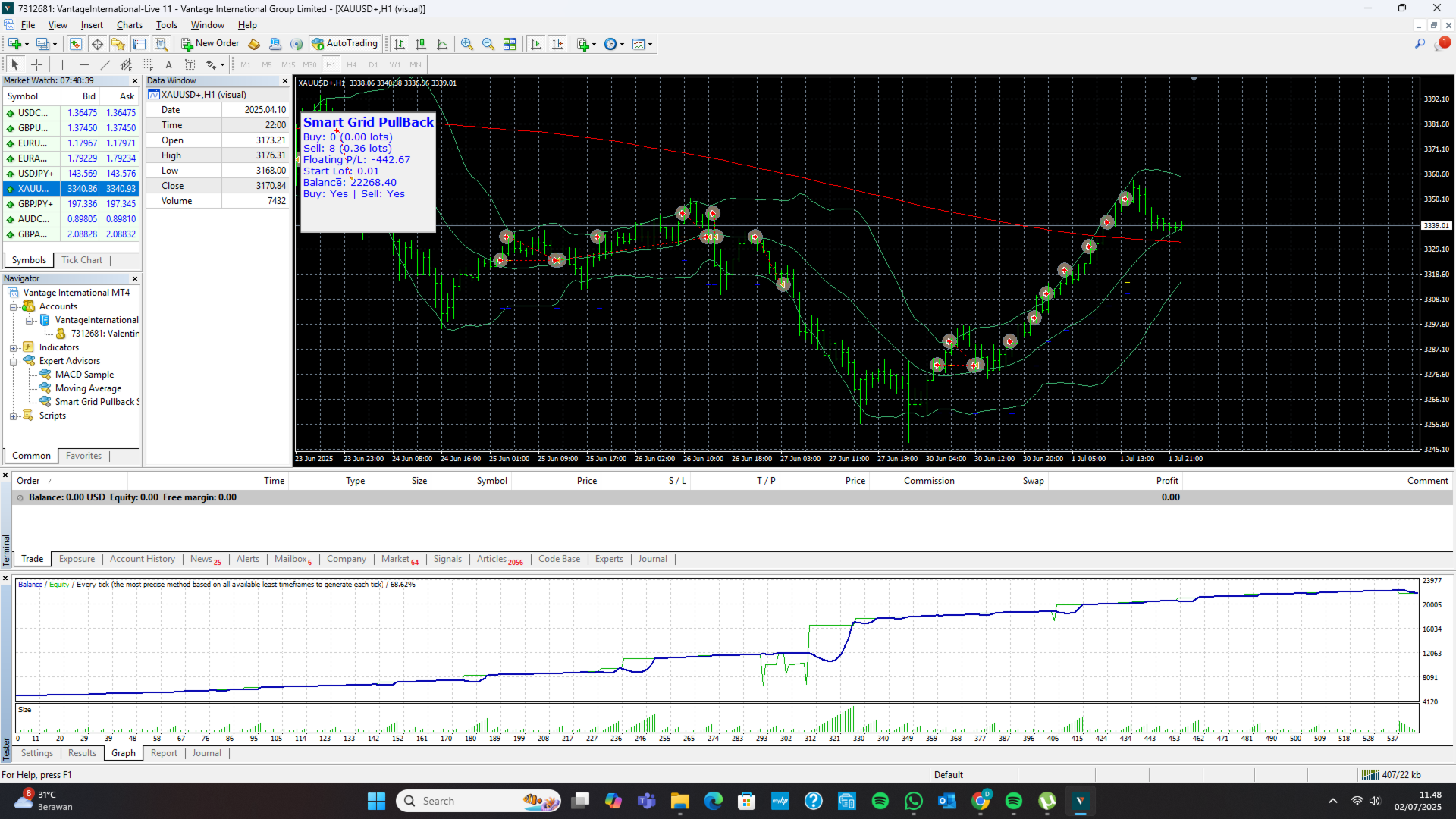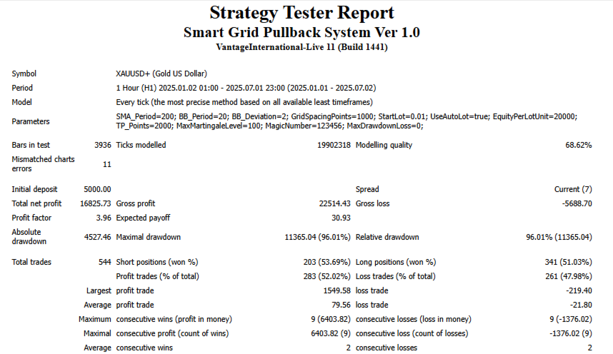 Smart Grid Pullback System is a fully automated Expert Advisor designed to capitalize on market retracements using a powerful grid and martingale strategy. It opens positions based on pullback patterns and trend direction, with automatic position management, dynamic lot sizing, and drawdown control.