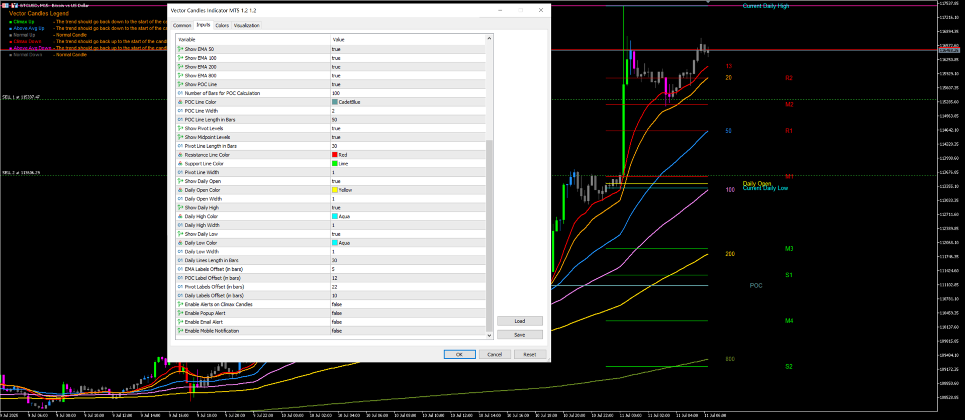Volume: Average bars (20), High multiplier (2.0).EMAs: Show/hide each, thickness (2).POC: Show (yes), Bars to check (100), Display length (50), Color (blueish).Pivots: Show (yes), Display length (30), Colors/Thickness.Legend: Show (yes), Position, Font.Alerts: On for high volume, Types (popup, email, phone).Labels: Move them right by a few bars.