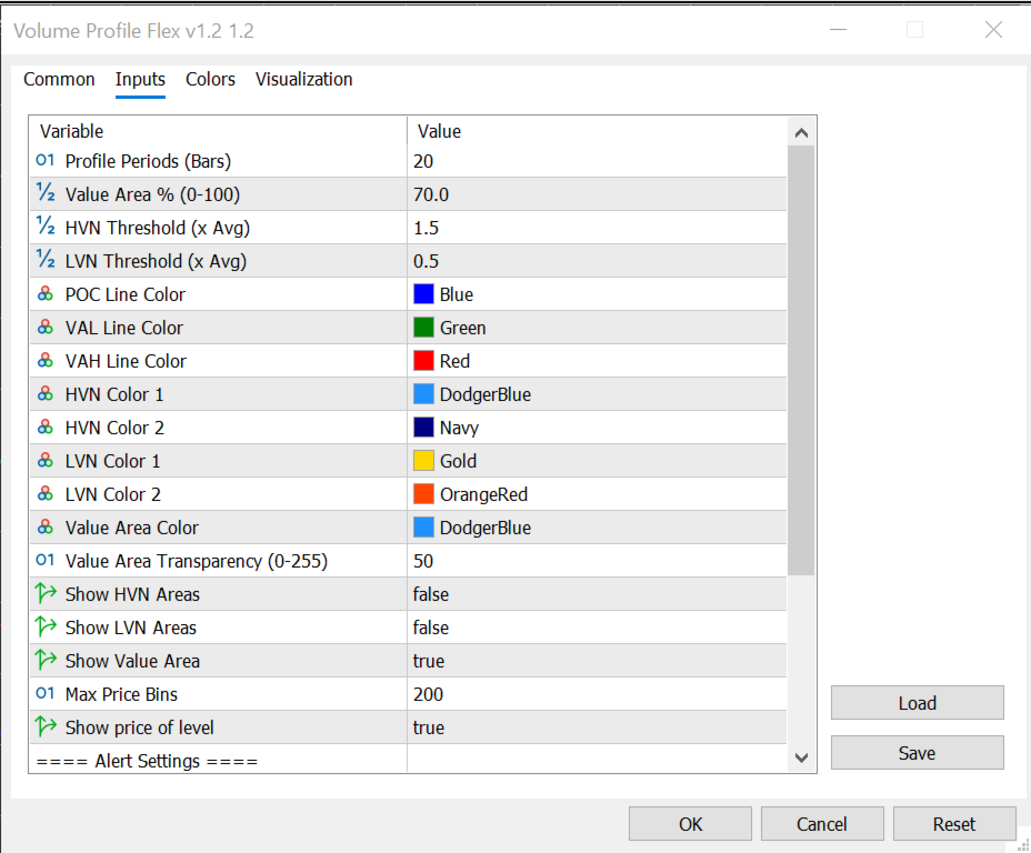 The Value Area is calculated using a customizable percentage (default value is 70%) and represents the price range where most trading activity occurs.