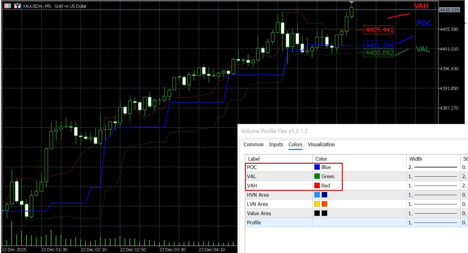 Real-time price labels are displayed directly at the POC, VAH, and VAL levels.