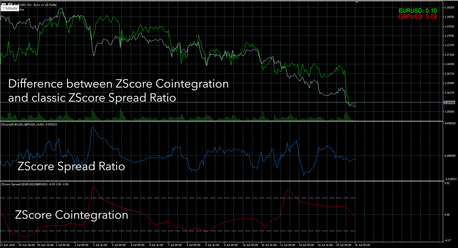 The indicator calculates and displays the Z-Score spread (cointegrated spread) between two financial instruments. It is based on the ordinary least squares (OLS) method to estimate the relationship coefficient between the prices of two symbols and then normalizes the spread distribution into Z-Score values.