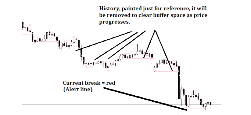 - Indicator is coded based on actual candle breaks and not coded based on any pivot or predefined values or specific number of candles high and low.