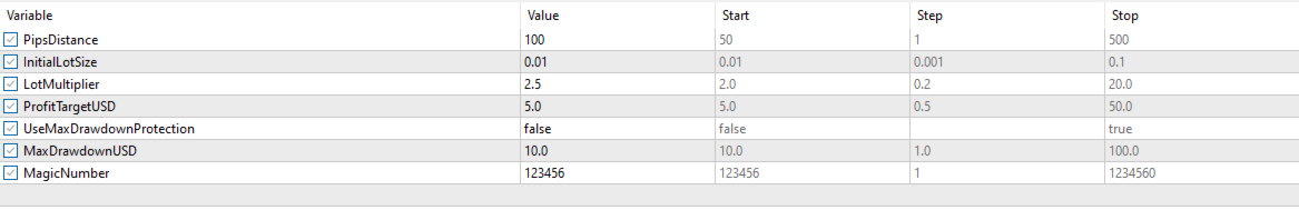 Once total profit in USD reaches the specified ProfitTargetUSD , all trades are closed, and the system resets.