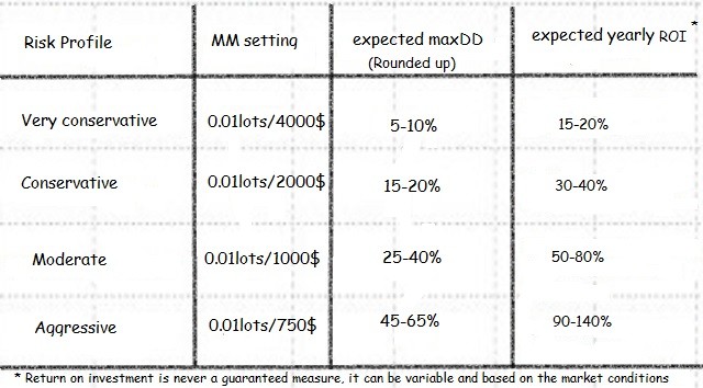 Hello, this is a low risk settings profile (0.01 lots each 2000$), with these settings you should expect a maxDD of 15% with average annual ROI something like 30-40%+