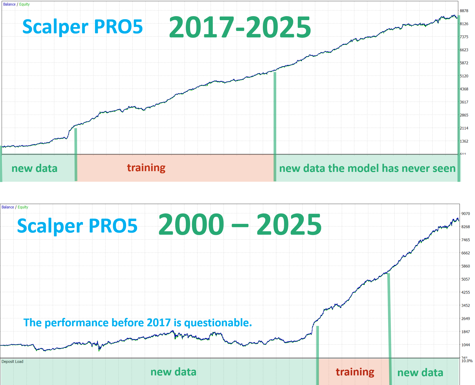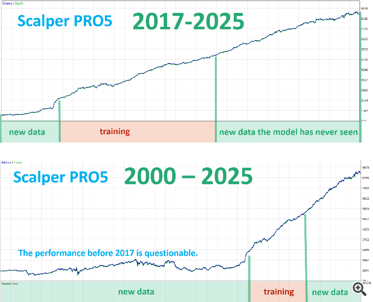 Scalper PRO5 model shows growth over the 3 years leading up to the training period, and maintains good robustness after training.