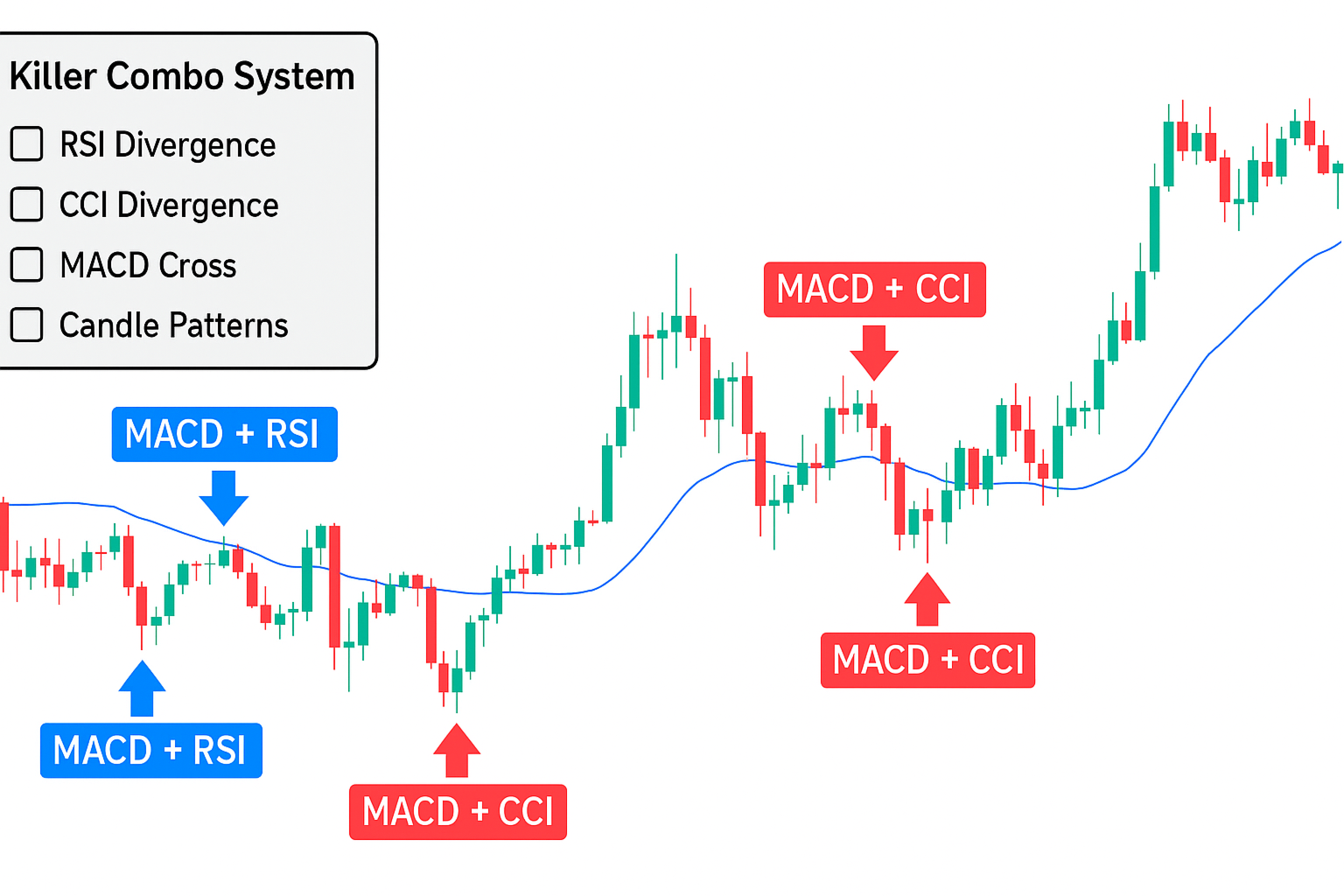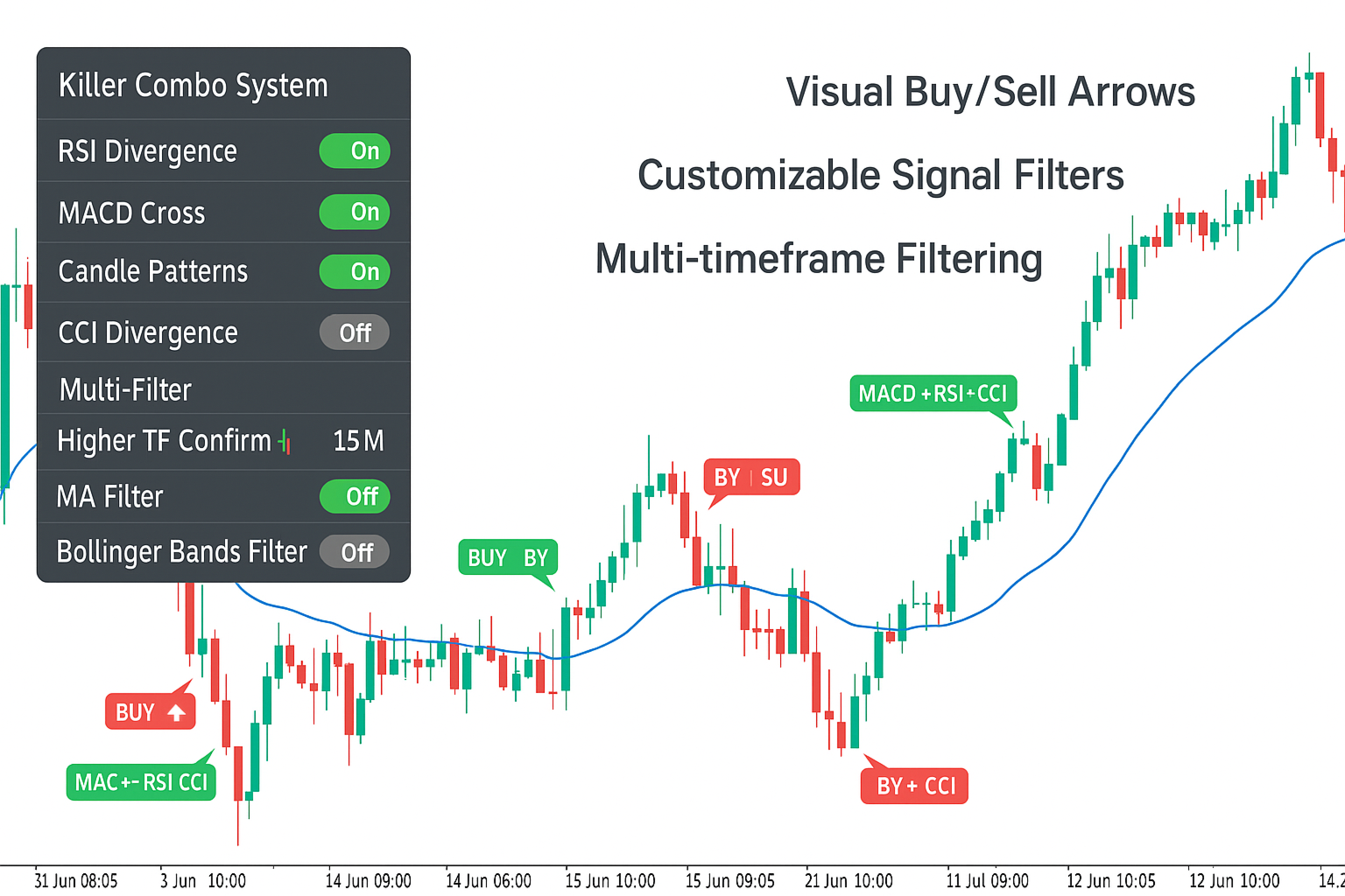 Killer Combo System is a multi-strategy indicator designed to highlight potential reversal and continuation setups by combining several technical modules in one tool.