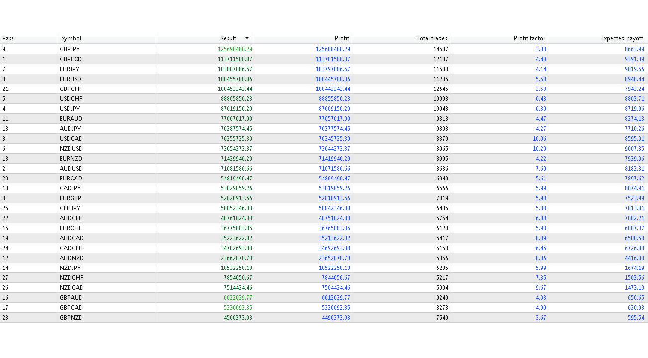 Eurusd, USDJPY, GBPUSD, AUDUSD, USDCAD, USDSHF, NZDUSD, EURJPY, GBPJPY, EURGBP, AUDJPY, EURAUD, EURCHF, AUDNZD, NZDJPY, GBPAUD, GBPCAD, ERNZD, AURNZD, AUDC AD, GBPCHF, AUDCHF, EURCAD, CADJPY, GBPNZD, CADCHF, CHFJPY, NZDCAD, NZDCHF.