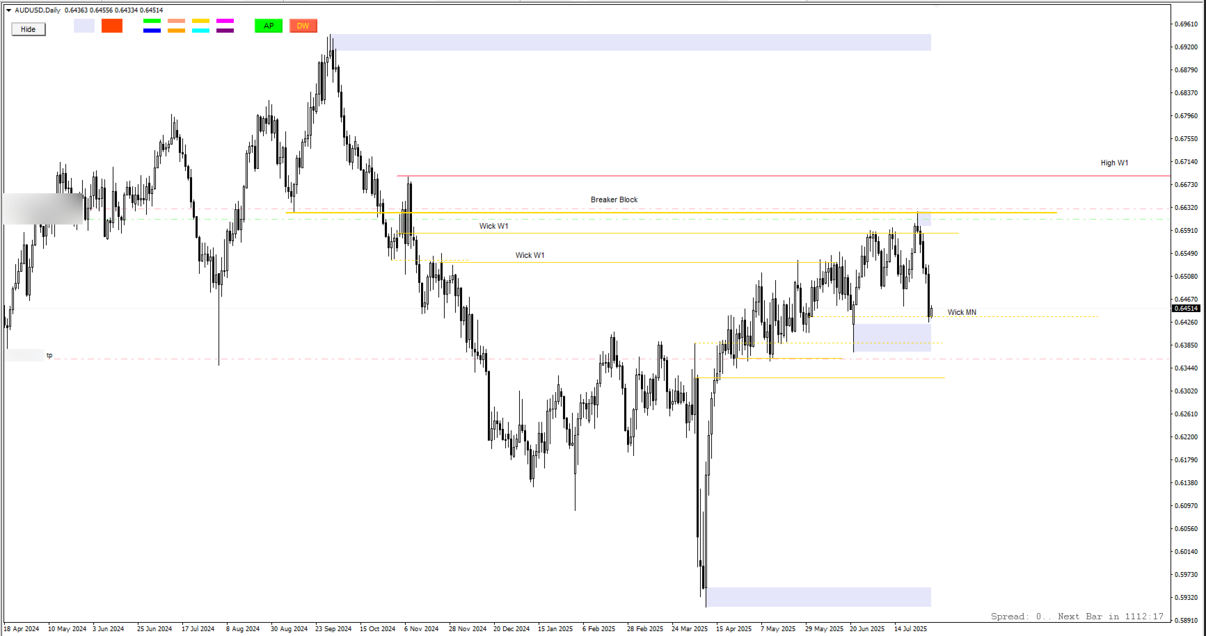 Creazione di linee orizzontali di supporto (AP) e resistenza (DW) a 1 cm dal prezzo di offerta corrente.