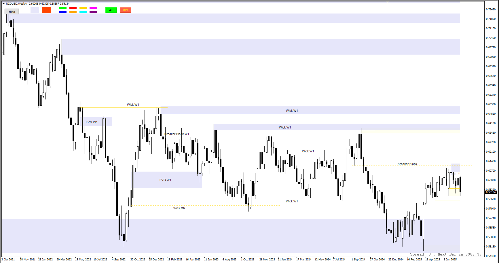 Supporto multi-timeframe: le linee di tendenza e i rettangoli vengono visualizzati sui tempi attuali e inferiori, mentre le linee AP/DW e i pulsanti chiave sono visibili su tutti i tempi.