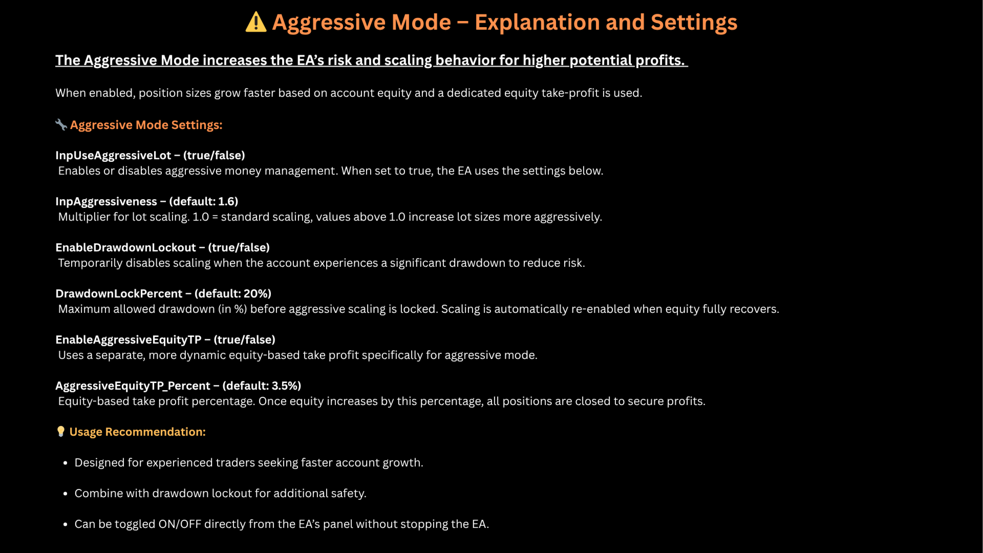 - Modalità Aggressive per scalare al massimo i lotti (attivazione manuale)