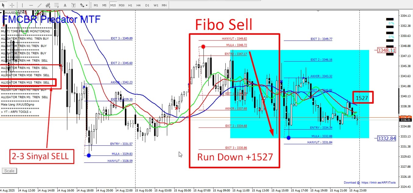 🔔 Tunggu munculnya alert Fibo SELL (warna biru)