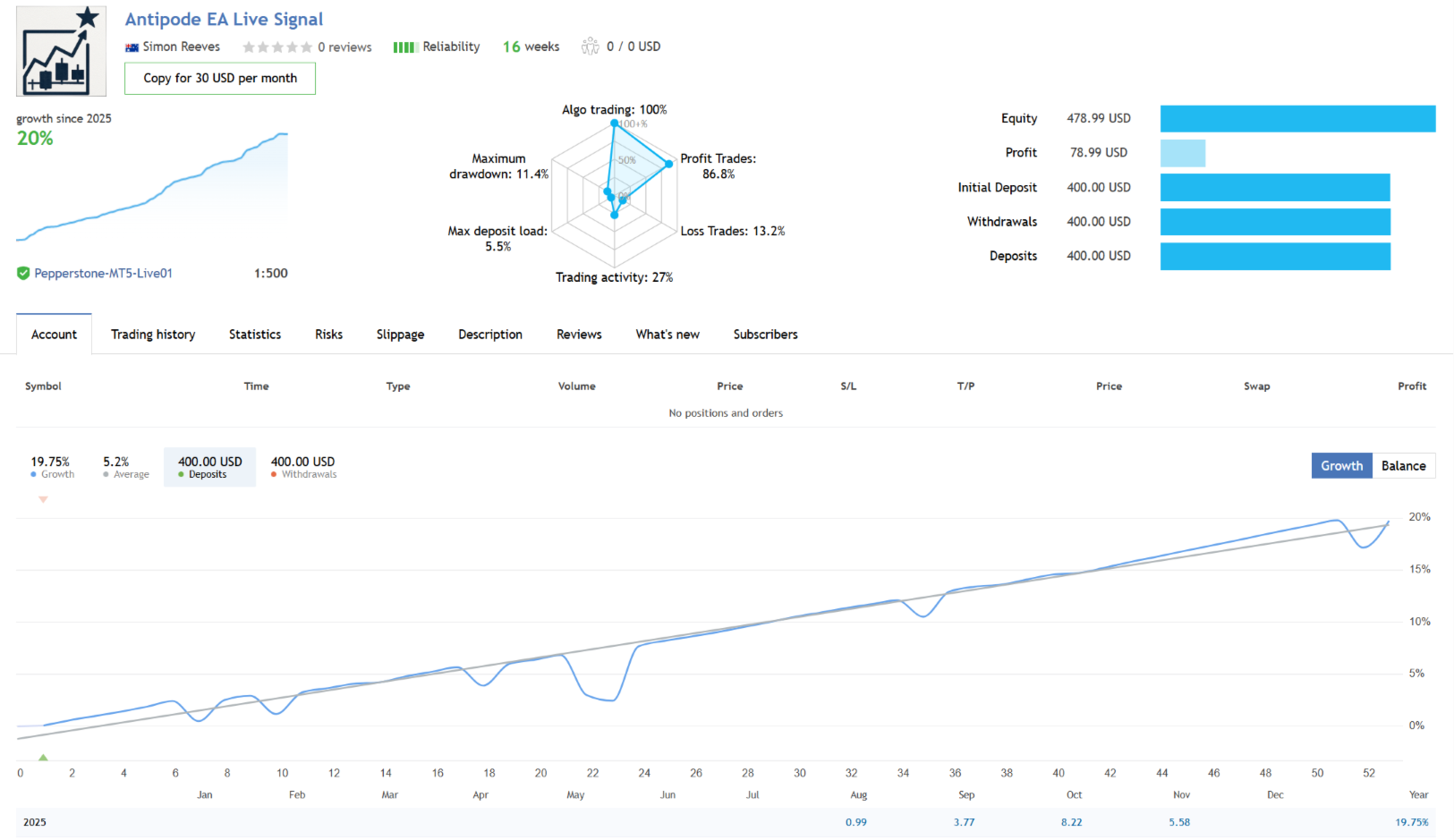 Antipode is a sophisticated grid trading Expert Advisor specifically engineered for AUDCAD, combining advanced signal filtering with multi-layered risk protection. Developed by a trader with 10 years of financial markets experience, Antipode prioritizes capital preservation while systematically capturing profit opportunities.