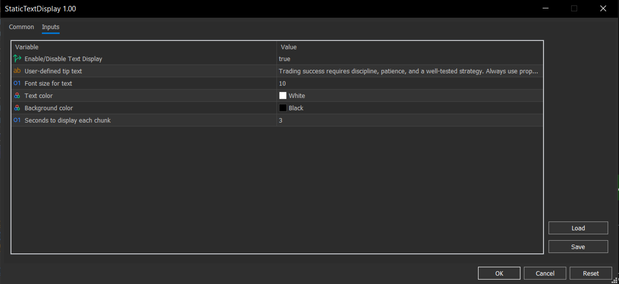 Visualizzazione di Testo Statico è un Expert Advisor (EA) leggero e facile da usare per MetaTrader 5, progettato per ispirare ed educare i trader mostrando suggerimenti di trading motivazionali direttamente sul tuo grafico. Con un elegante sfondo nero centrato e testo bianco in un font a spaziatura fissa, questo EA offre consigli concisi e pratici in frammenti rotanti per mantenerti concentrato su un trading disciplinato. Perfetto sia per i principianti che per i trader esperti, promuove principi chiave come la gestione del rischio, la pazienza e lo sviluppo di strategie.