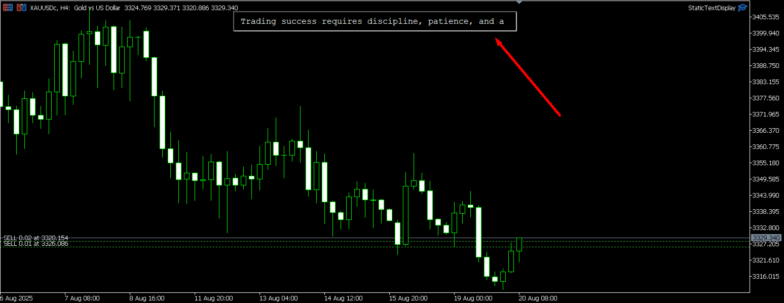 Perché scegliere Visualizzazione di Testo Statico? Che tu stia affinando la tua disciplina di trading o cercando motivazione quotidiana, questo EA mantiene la saggezza essenziale del trading in primo piano. I suggerimenti predefiniti sottolineano la gestione del rischio, il test delle strategie e il controllo emotivo, ma puoi personalizzare il testo per adattarlo alla tua filosofia di trading. Ideale per i trader che apprezzano l'educazione e la coerenza.