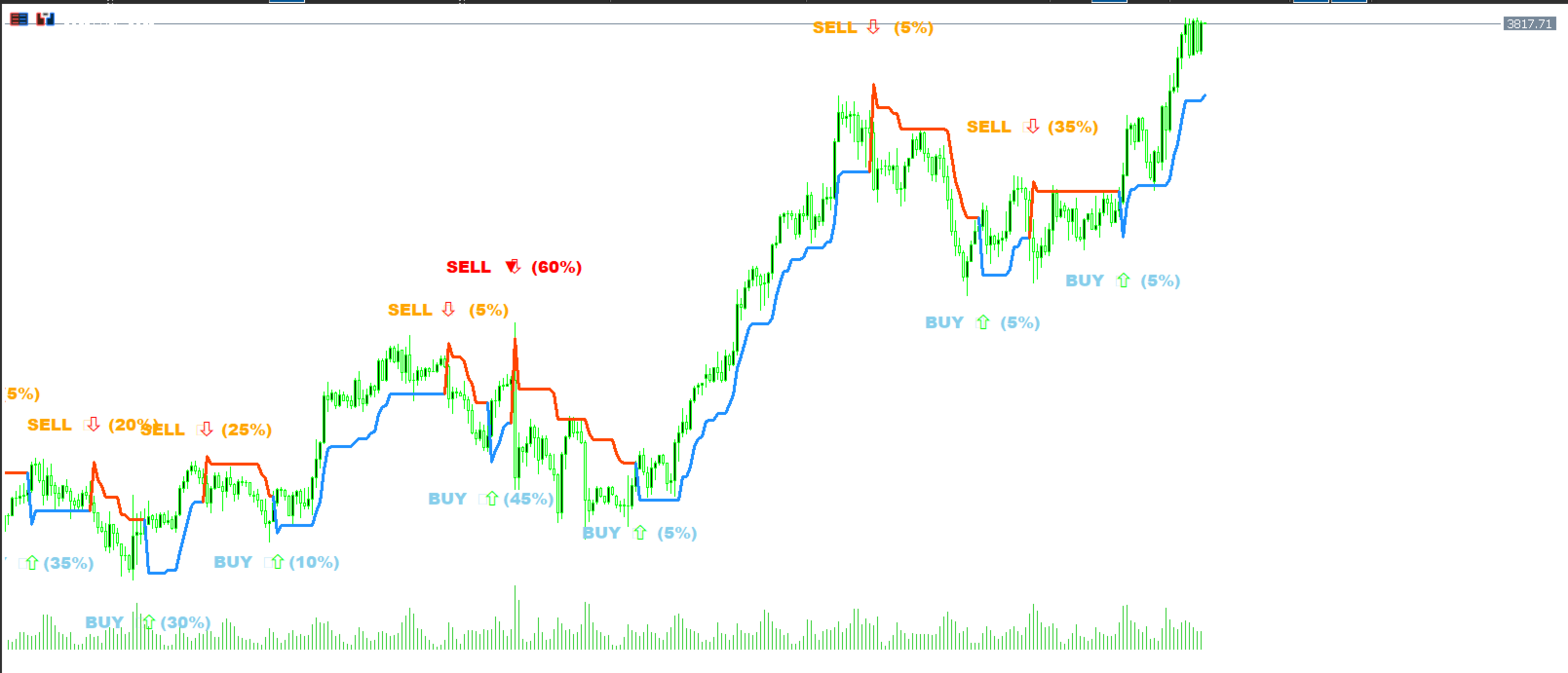 Clear BUY/SELL signals with arrows and signal strength (%)