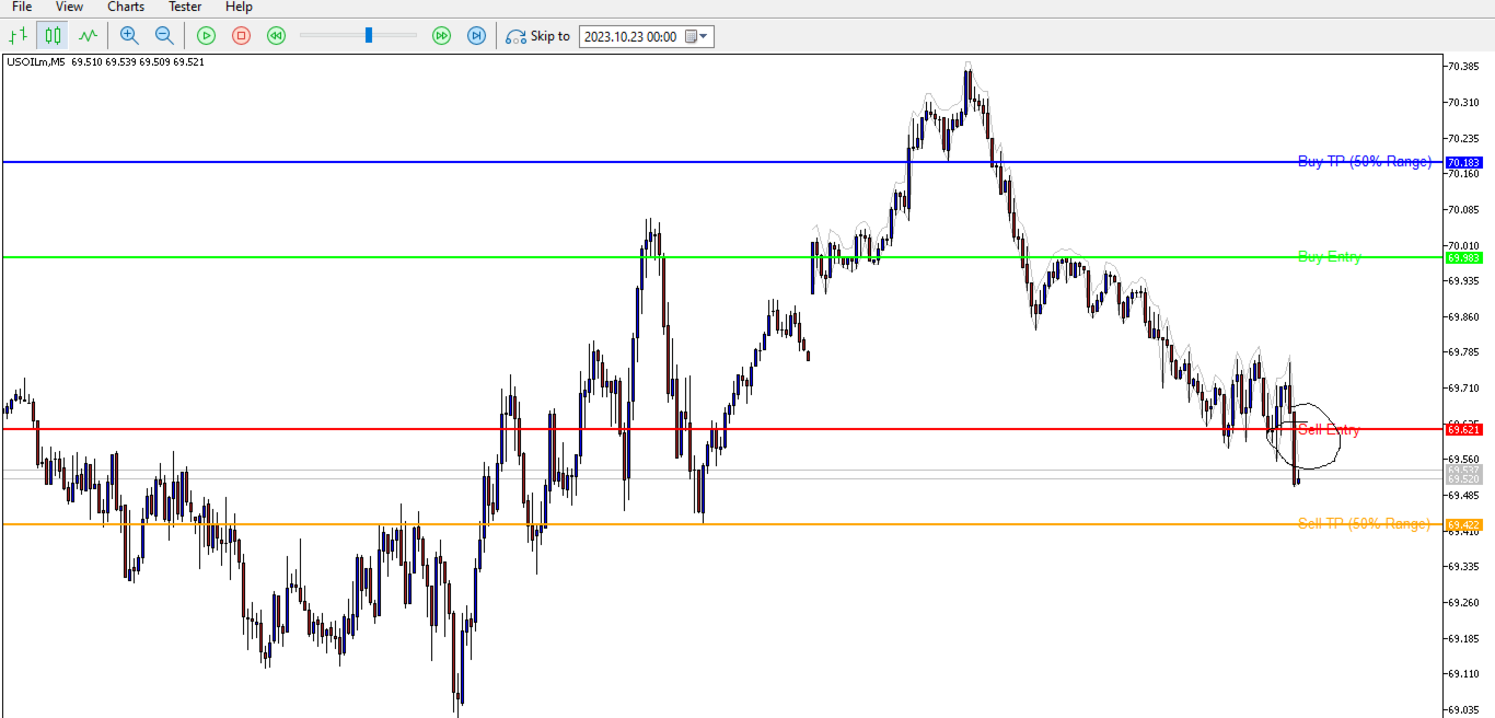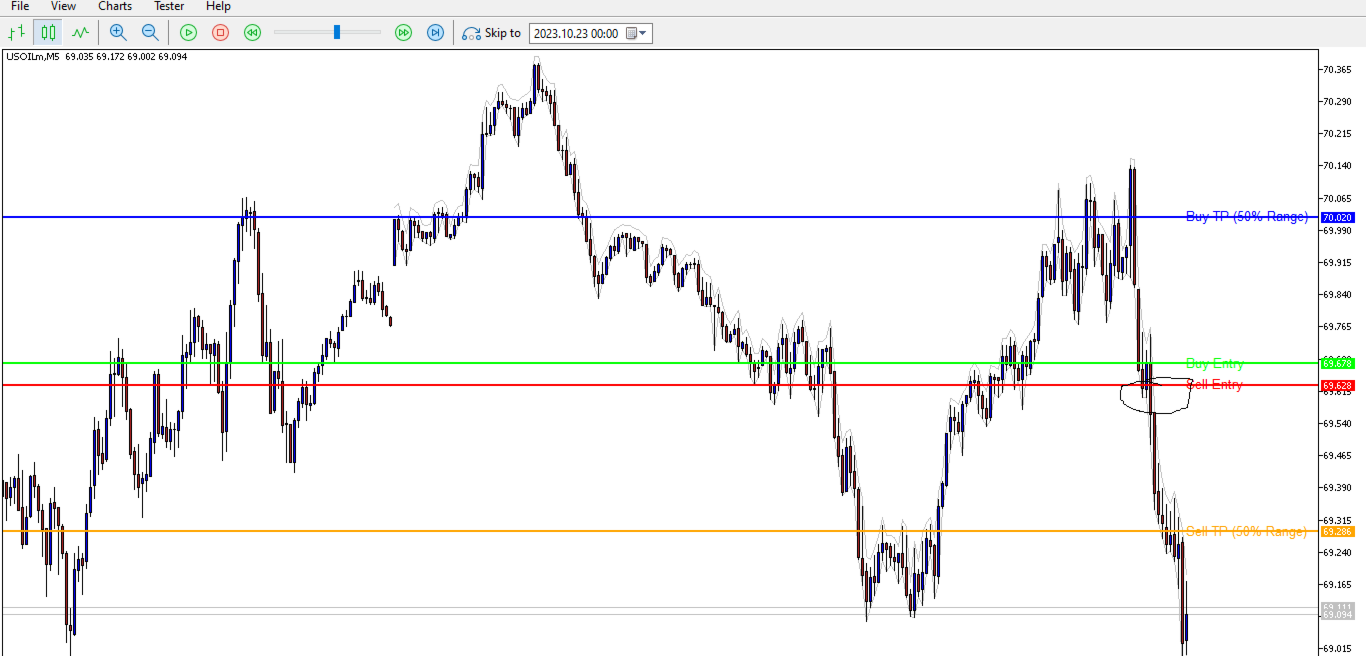 This custom MT5 indicator automatically draws trading levels based on the previous H4 candlestick. It is designed to help traders quickly identify potential entry and take profit (TP) points according to a simple breakout strategy. What it does:- Draws Buy Entry line at the previous H4 High.- Draws Sell Entry line at the previous H4 Low.- Calculates the 50% range of the previous H4 candle and plots: • Buy TP line above the High. • Sell TP line below the Low.- Adds text labels directly on the chart so the levels are clearly marked: • “BUY ENTRY” (green) • “SELL ENTRY” (red) • “BUY TP (50%)” (orange) • “SELL TP (50%)” (orange) Inputs:- BuyLineColor → Color of Buy Entry line (default: Green).- SellLineColor → Color of Sell Entry line (default: Red).- TPLineColor → Color of TP lines (default: Orange).- LineStyle → Line style (solid, dash, dot, etc.).- LineWidth → Thickness of the lines.- LabelShiftBars → How many bars to the right labels are displayed. How to use: 1. Apply the indicator to any chart and timeframe. 2. The indicator automatically calculates levels from the last completed H4 candle. 3. Use the levels for potential breakout trading: • Buy trade setup: Entry at H4 High, TP at High + 50% of range. • Sell trade setup: Entry at H4 Low, TP at Low – 50% of range. Recommended market:- This strategy works on all instruments, but it performs best on USOIL due to its strong volatility and well-defined H4 breakouts. Best for:- Traders who use H4 breakout strategies.- Quick identification of entry and target levels.- Visual clarity with auto-labeled horizontal lines