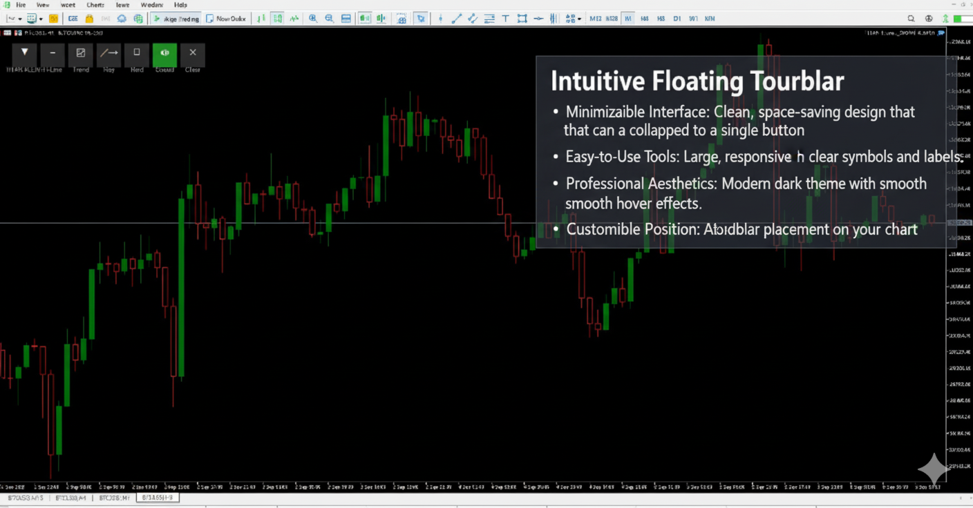 TITAN CHART ALERTS è un sofisticato Expert Advisor per MetaTrader 5 che offre strumenti di disegno di livello professionale e avvisi di prezzo intelligenti direttamente sulla tua piattaforma MT5. Progettato con un'interfaccia elegante e moderna ispirata al design minimalista moderno, questo EA migliora il flusso di lavoro dell'analisi tecnica con potenti funzionalità di automazione.