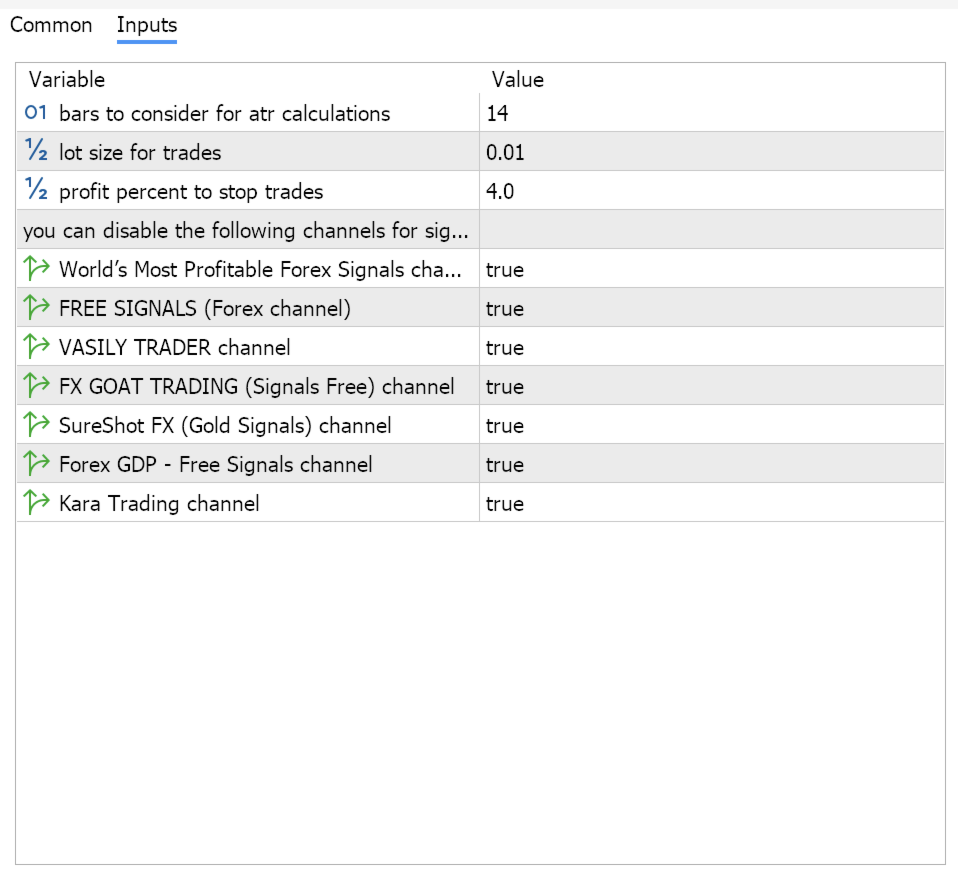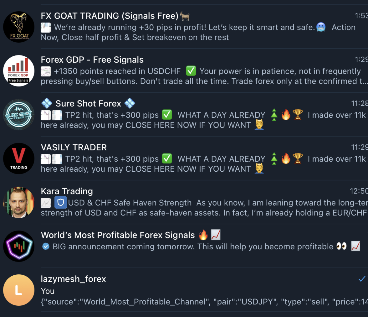 TelegramTrades è un Expert Advisor che ascolta i seguenti canali Telegram per i segnali di trading (segnali di trading generati dagli esperti) e li converte in operazioni valide. Vengono ascoltati i seguenti sette canali e, non appena arrivano segnali di trading su quei canali, lo script Pyrogram, costantemente in esecuzione su un server, analizza il segnale per trasformarlo in un segnale di trading valido e lo inoltra al mio bot Telegram. Una volta ricevuto un segnale valido con stop loss, take profit, prezzo, tipo di operazione e simbolo, questo viene letto dall'EA per eseguire le operazioni sui grafici.