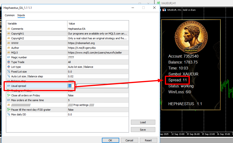 Make sure you have set the Usual spread value equal the usual XAUEUR speed which you can see on the dashboard