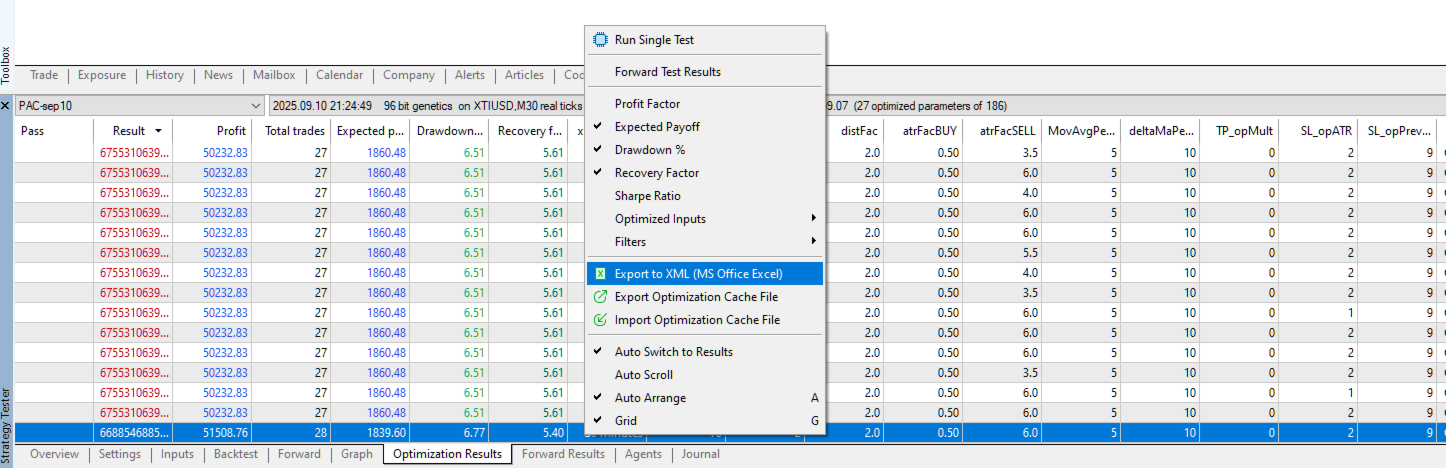 Profit, Draw Down, Recovery Factor, Sharpe Ratio, Profit Factor.