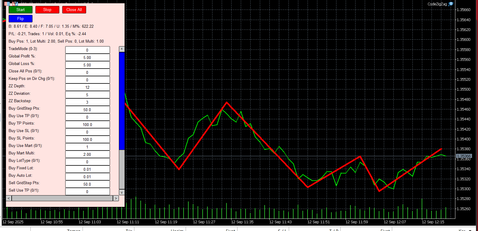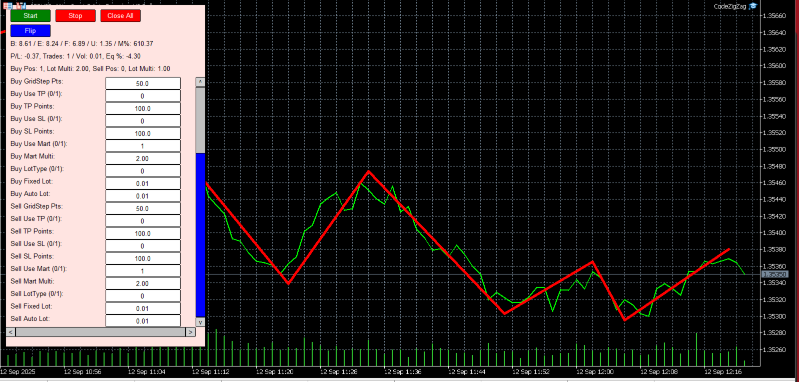 Sintesi: Questo EA costruisce una griglia simmetrica con sole ordini a mercato e attiva i moduli Buy/Sell in base alla direzione del ZigZag. Può aumentare la size con martingala e si resetta quando la variazione dell’equity raggiunge le soglie Global Profit % / Global Loss %, quando cambia la direzione del ZigZag, o con i comandi Close All / Flip. Tutti i parametri sono modificabili in tempo reale dal pannello.