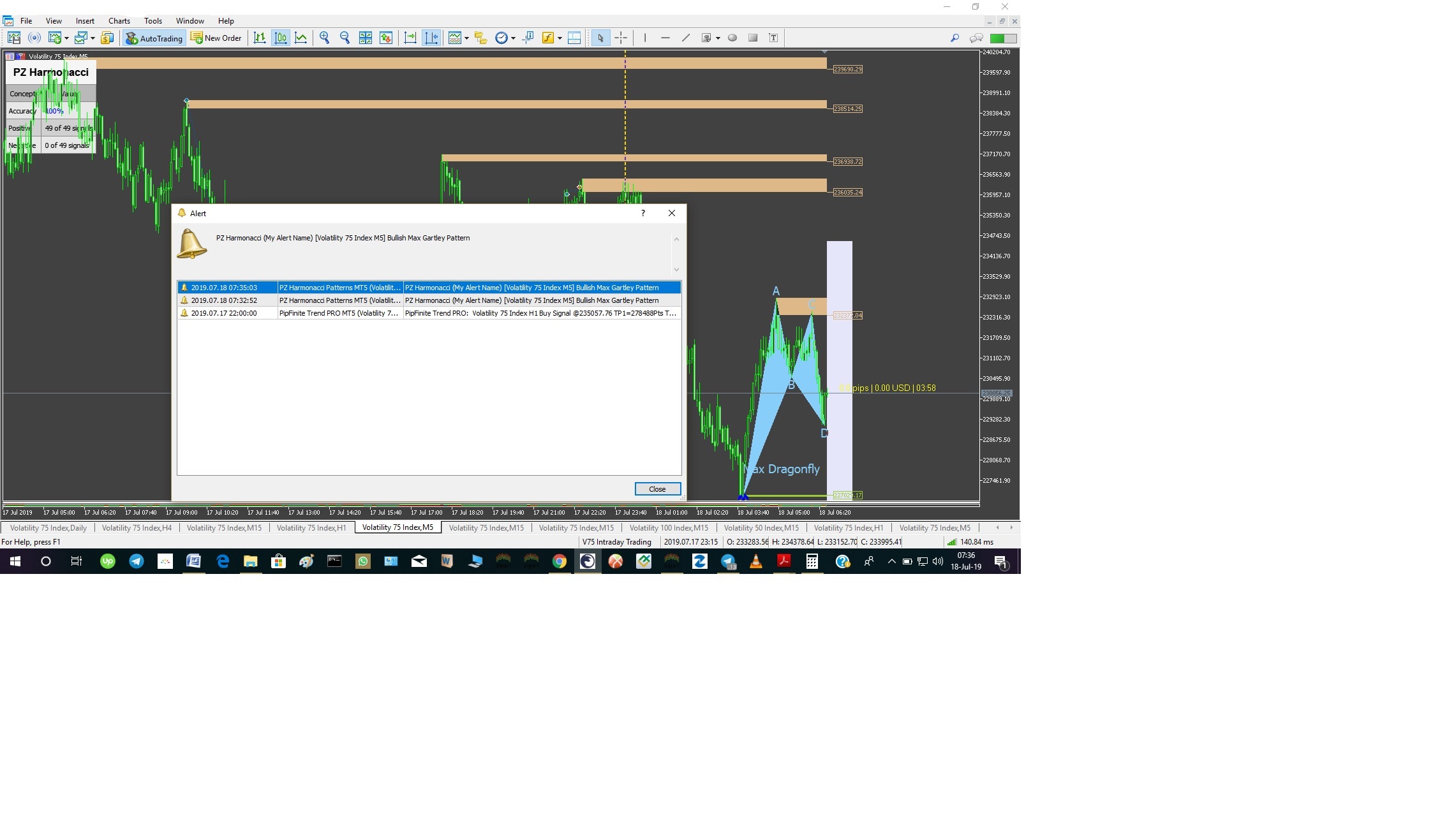 I received the first signal this morning and what I saw on chart is different from the signal alert that I received. I received signal alert for Bullish Max Gartley Pattern on M5 chart, but on M5 chart reality, it was Bullish Max Dragonfly Pattern that is shown.