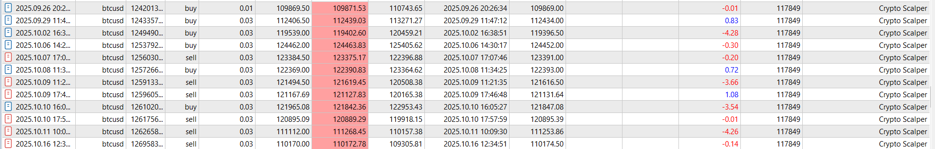• Use a low-latency VPS and a broker with consistently tight BTC spreads/commissions. Execution quality matters a lot for a scalper.