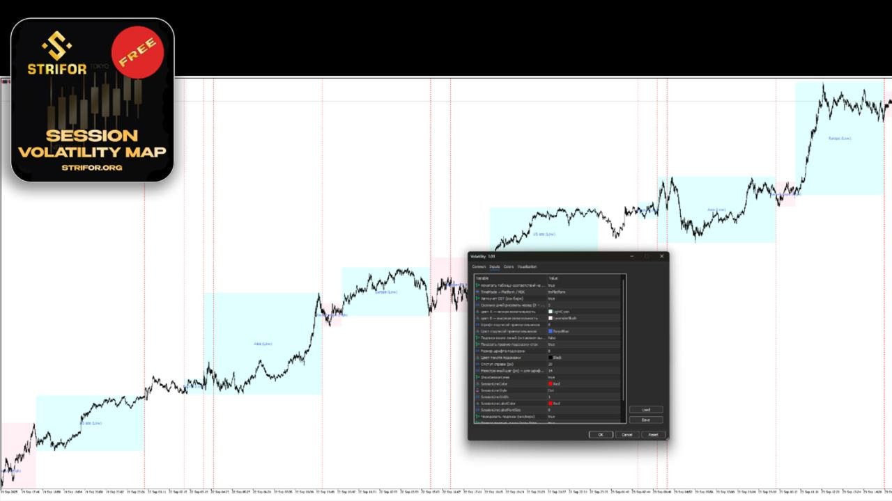 Session Volatility Map is an indicator that displays key trading sessions (Asia, Europe, US) directly on the chart.