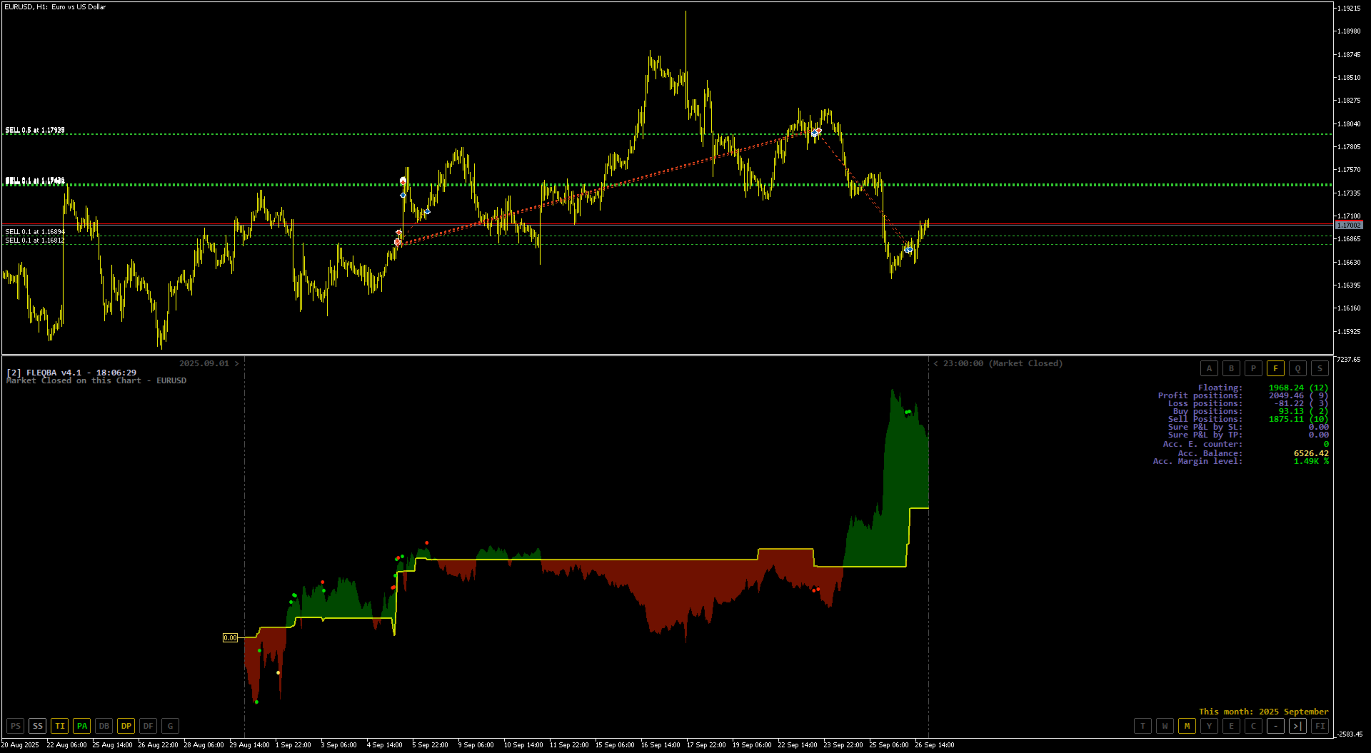 In Back Test non ci sono cronologie di trading reali né posizioni aperte interpretabili dall’indicatore. Se utilizzi un modello (tester.tpl) con un Expert Advisor, i dati visivi vengono mostrati, ma i pulsanti non funzionano – si tratta di una limitazione di MetaTrader 5. Questo indicatore dà il meglio di sé in un ambiente di trading reale.