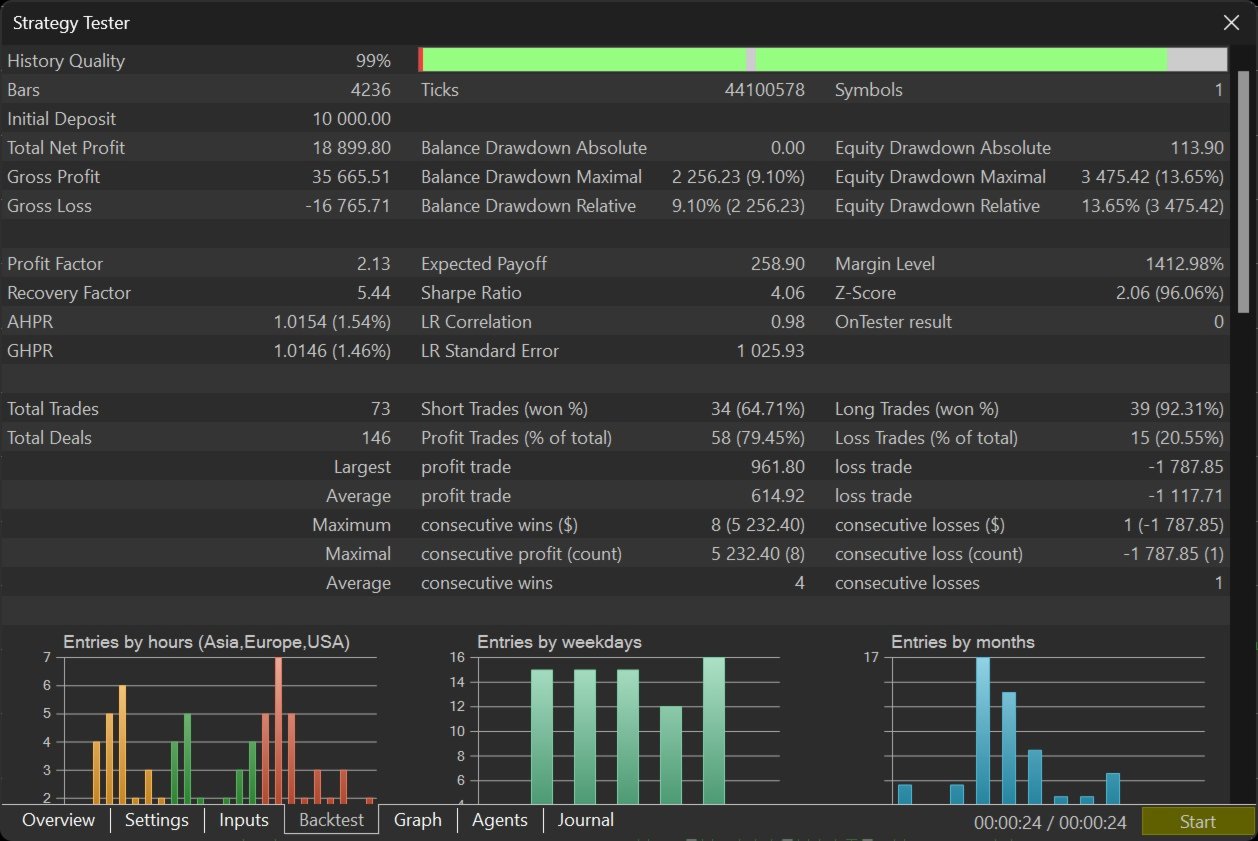 This Expert Advisor (EA) is designed for automated trading, with optimal performance on Gold (XAUUSD). It can also be applied to other currency pairs with proper tuning of the timeframe and stop-loss settings. The EA employs a robust trading strategy to identify market entry points, featuring dynamic lot sizing based on account balance or a fixed lot option. It includes risk management tools such as configurable stop-loss and take-profit levels and restricts trading between 00:00 and 02:00 to avoid low-liquidity periods. For best results, optimize the timeframe and stop-loss parameters for the chosen instrument and market conditions.