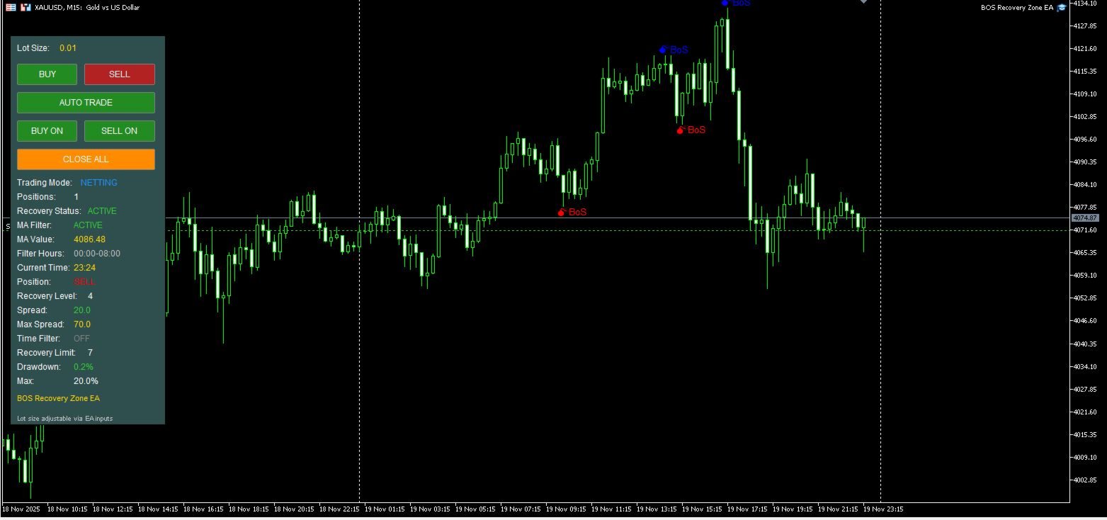 The BOS Recovery Zone EA is a sophisticated automated trading system that combines Break of Structure (BOS) strategy with robust dual-mode recovery management. Designed for serious traders who demand reliability and advanced risk management, this EA offers unparalleled flexibility with both Netting and Hedging modes to adapt to any broker environment.
