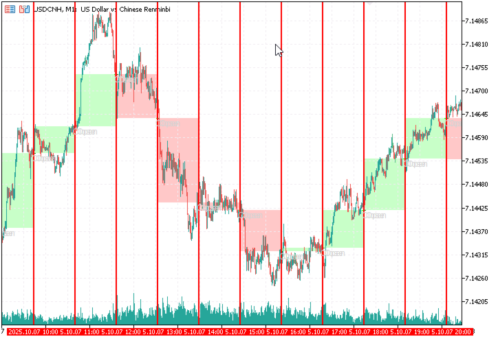 Note: The indicator creates chart objects (VLINE, RECTANGLE, TREND, TEXT). It also includes a hidden/dummy plot to satisfy platform requirements—no values are drawn on the indicator pane.