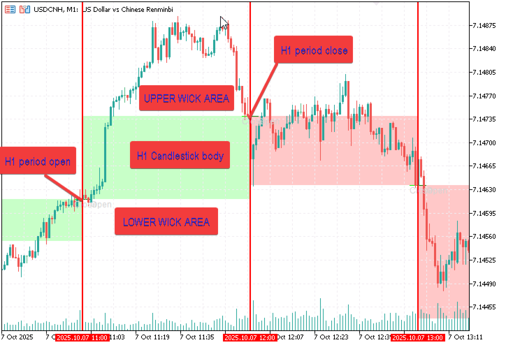 The indicator copies times, opens, and closes of the chosen Higher TF, draws vertical markers and optional rectangles for body fill, then (if enabled) copies Minor TF times and creates vertical markers only when they fall strictly between two adjacent HTF times. A periodic timer (Refresh Sec) updates drawings; unmanaged objects are removed to avoid clutter.
