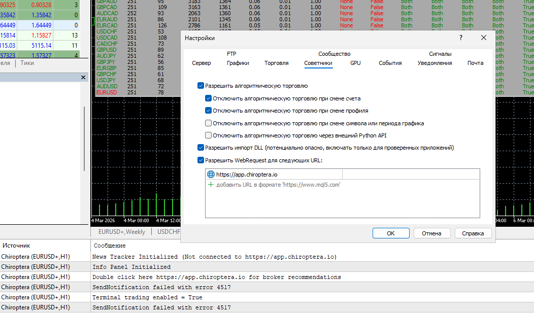 I cannot duplicate the error you are receiving. Are you able to access the website in your browser? And are you running the latest updates for MT5 and Chiroptera?