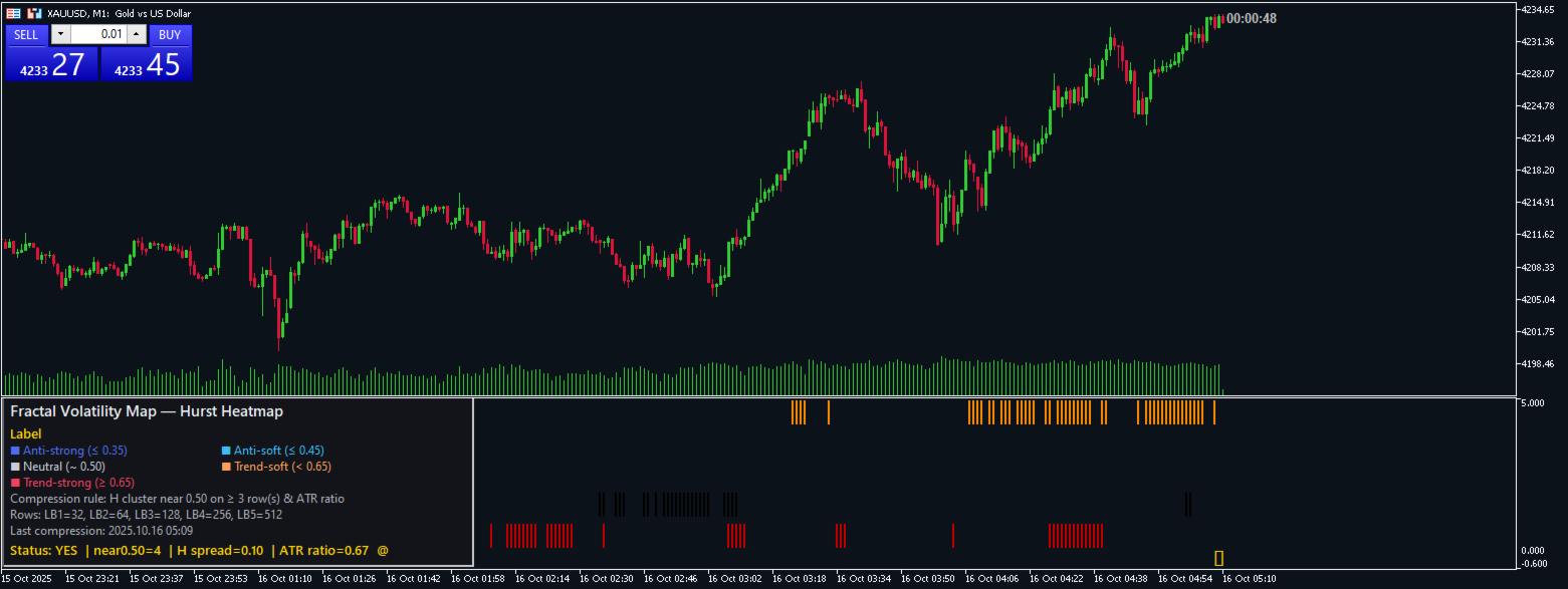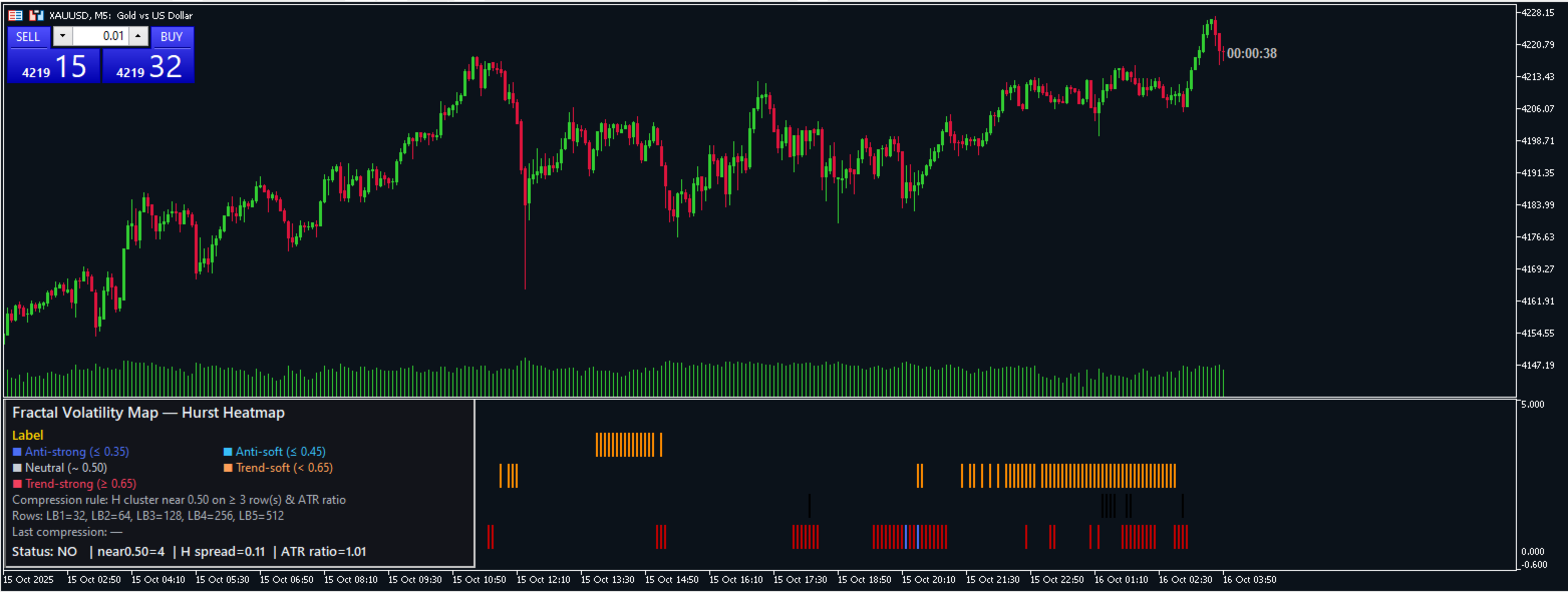 Fractal Volatility Map highlights volatility compression before expansion. It paints a five-row heatmap of the Hurst metric over multiple lookback windows and confirms compression with an ATR-based quiet-volatility check. When several rows cluster near neutral and volatility is suppressed, a Compression signal is shown on the last closed bar. This is an analysis/visualization indicator; it does not provide trading signals and does not guarantee any profit.