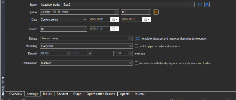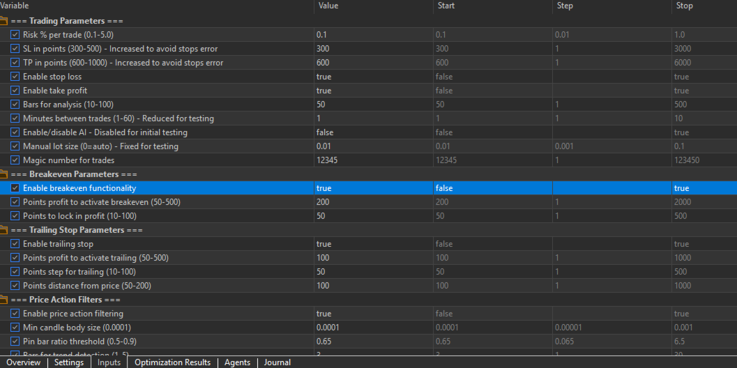 RiskPerTrade = 0.5 UseAI = false UseMultiTimeframe = true UseBreakeven = true UseTrailingStop = true MaxDailyDrawdown = 5.0 ForceTestTrades = true EnableDebug = true