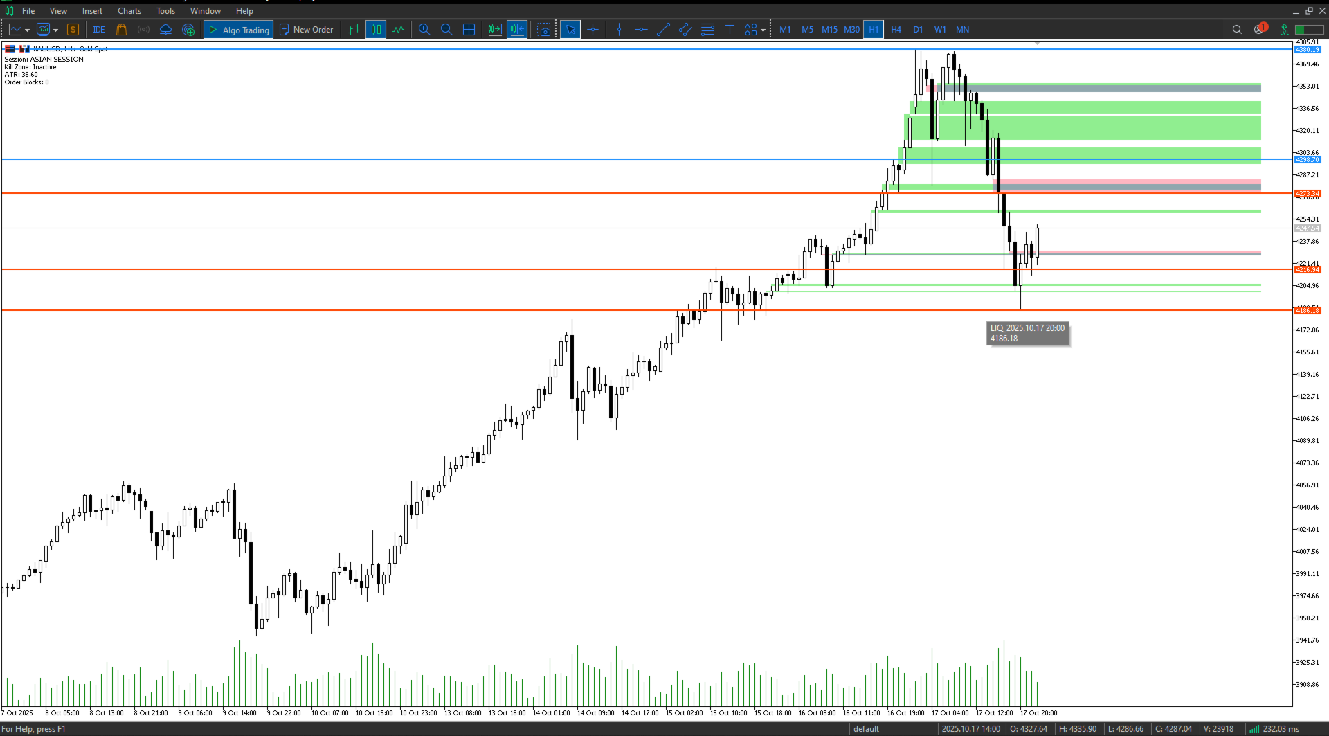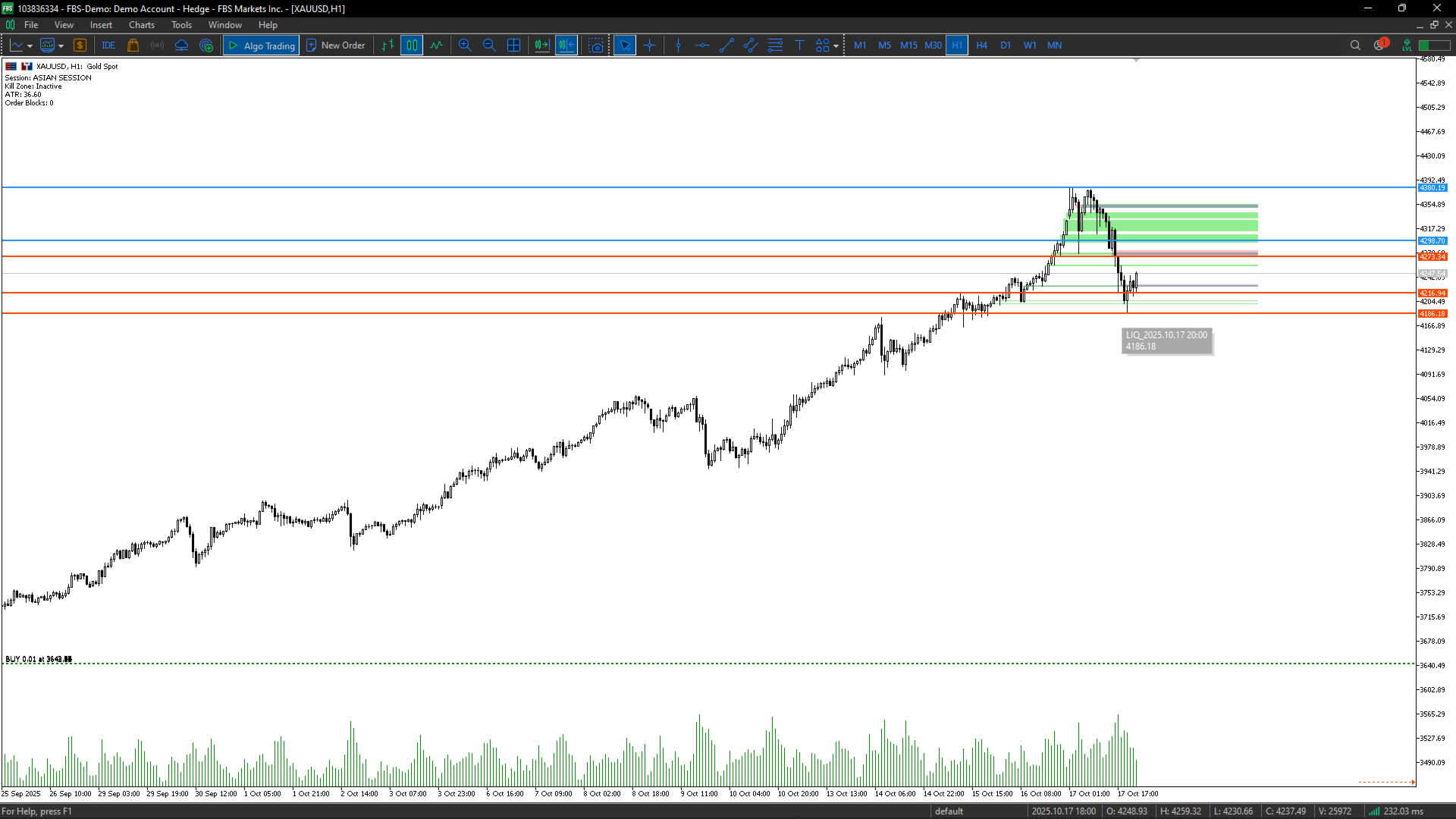 The indicator scans recent bars to locate Order Blocks, Fair Value Gaps, and Liquidity levels.
