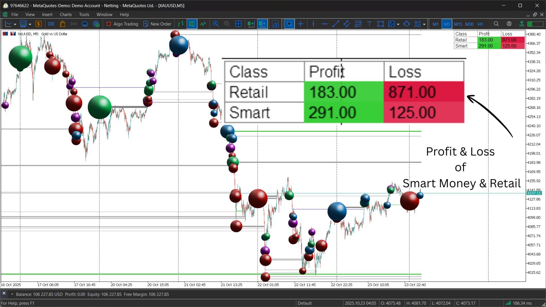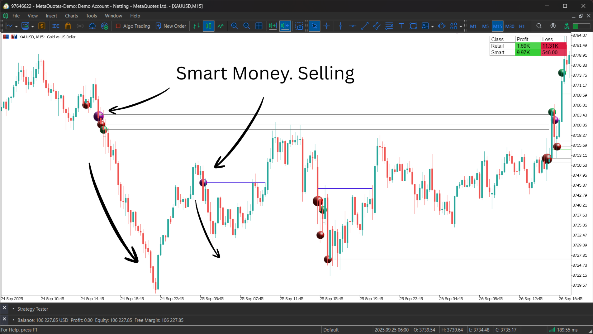 - Confirming Price Action: Use the bubbles to validate market movements. A bullish reversal pattern gains significant confirmation if accompanied by a large "Smart Money" buy bubble near the low. A breakout that is only accompanied by "Retail" buy bubbles (chasing the high) may be viewed with more skepticism, as it could be prone to failure.