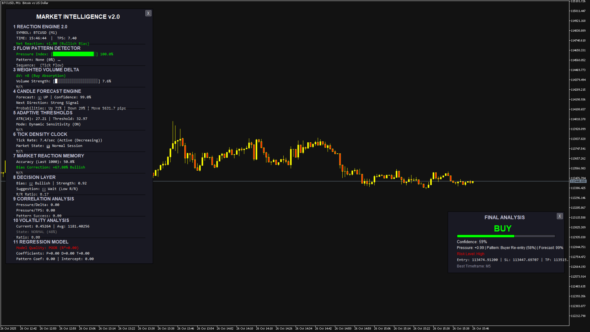 Purpose: Measures market pressure by analyzing tick movements, volume, and speed within a time window. How it works: Calculates weighted price changes, considers tick velocity and volatility, and applies EMA smoothing. Trading use: