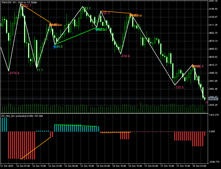 Swing Identification: ZigZag plots key highs/lows, feeding data into the histogram for momentum analysis.