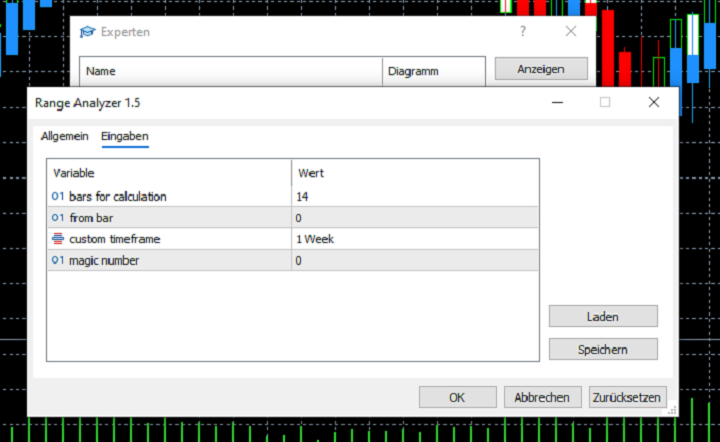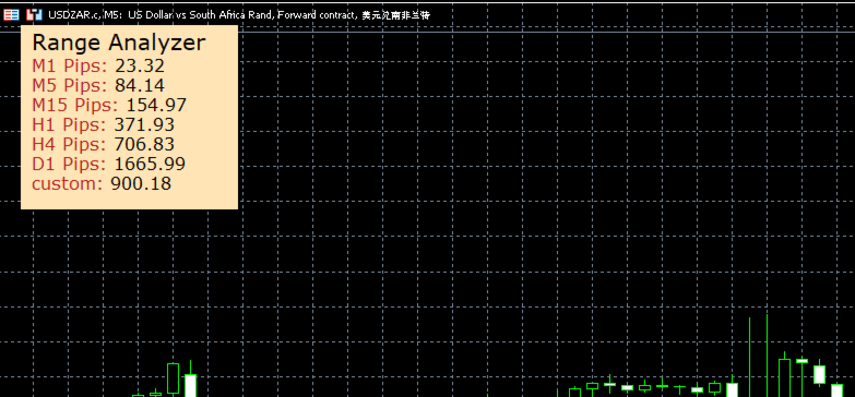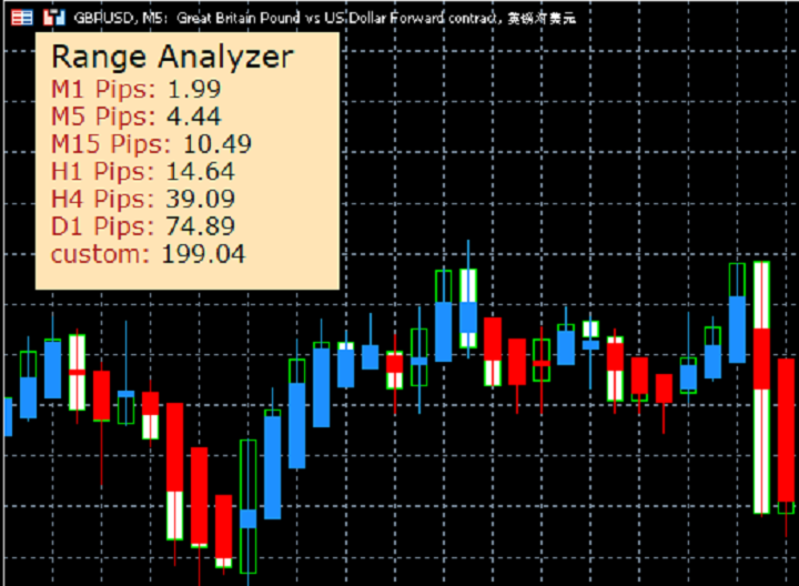 Range Analyzer calculates the Average True Range (ATR) values for different timeframes in pips to give a fast and simple overview about the volatility of the chosen symbol.