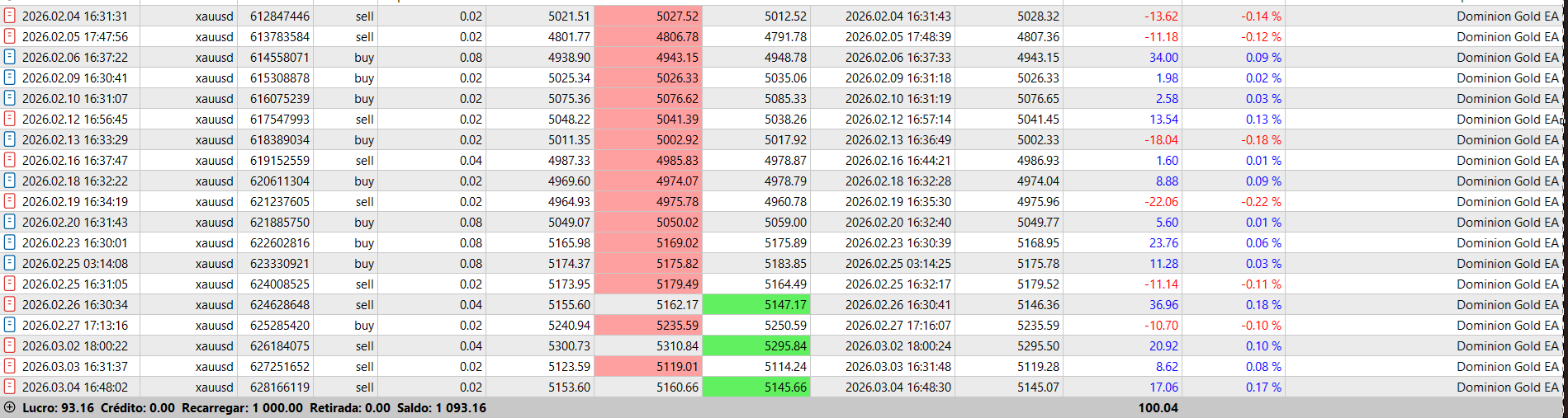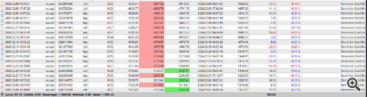 Recent results of Dominion Gold EA trading XAUUSD.