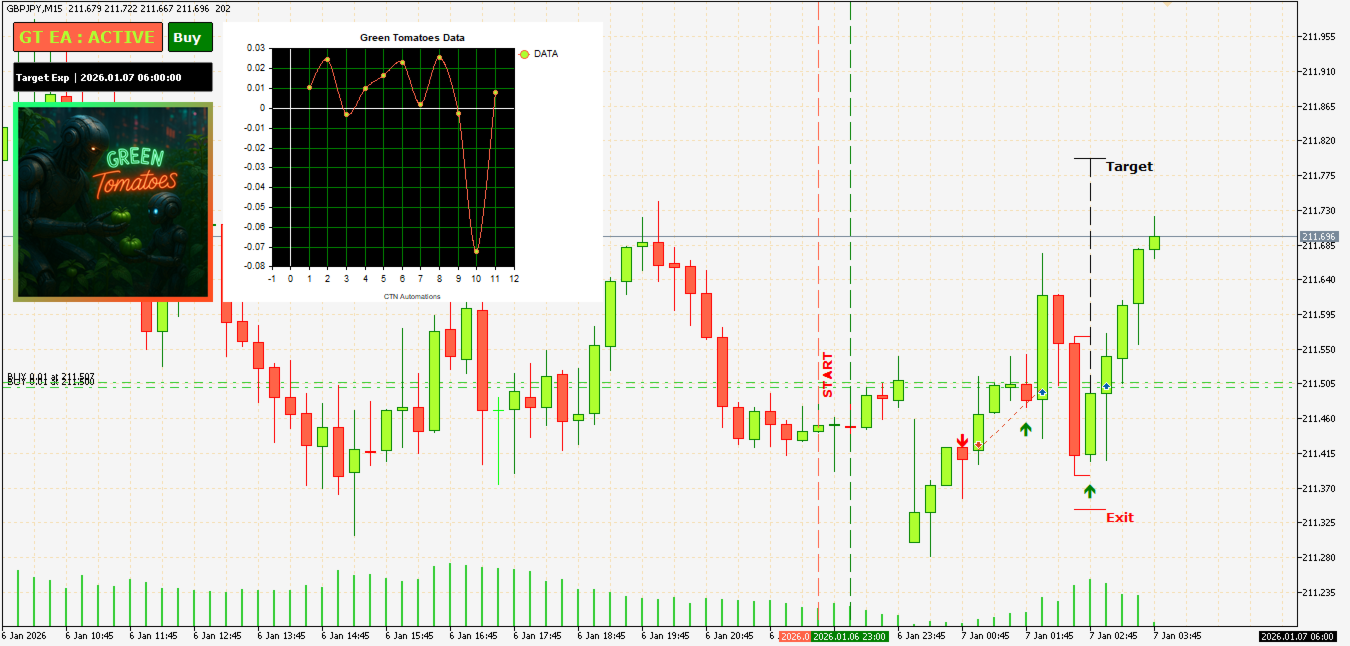 - For best performance, it is advised to use Green Tomatoes during trending and active market conditions. The algorithm is designed to perform well in markets with clear directional movement.