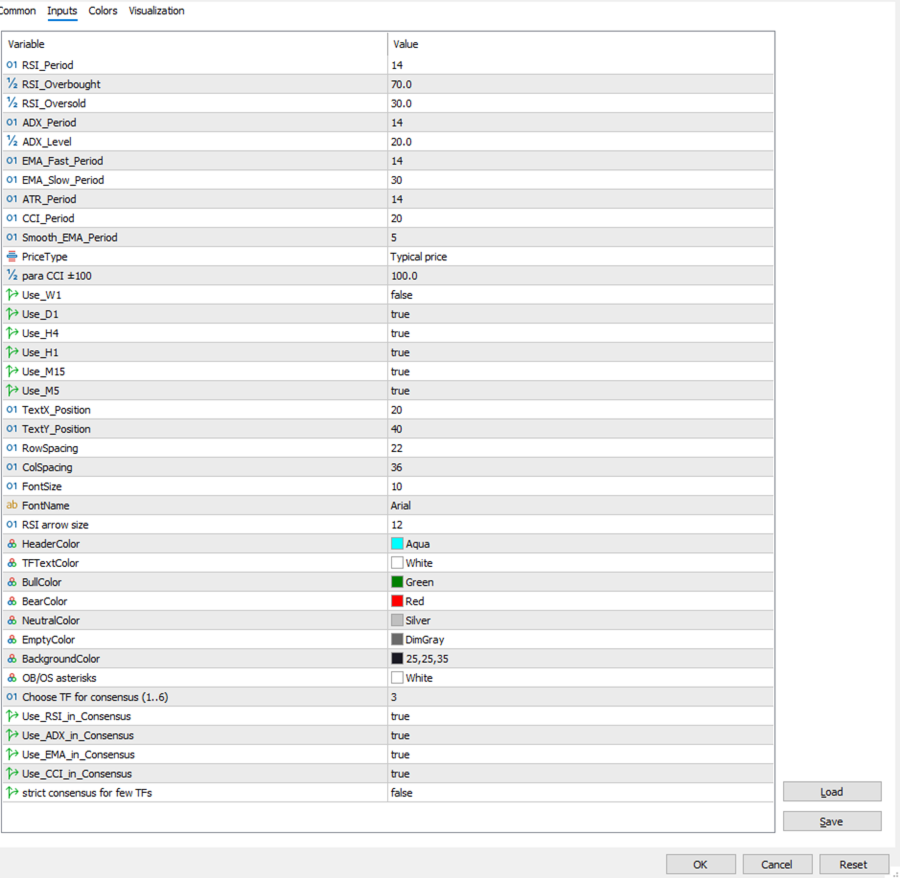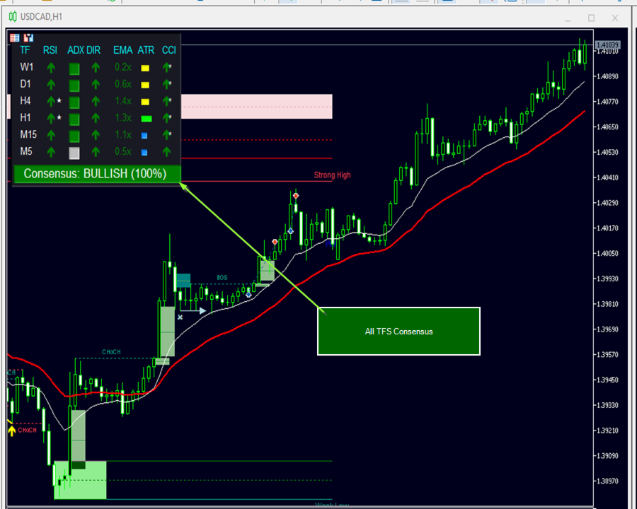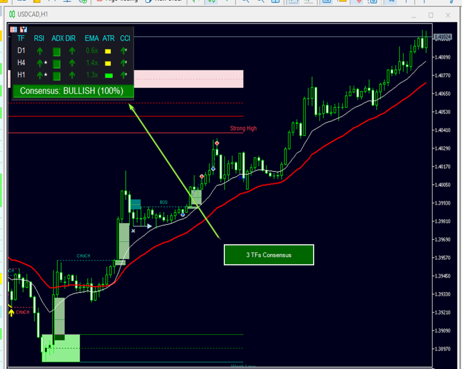 A powerful, clean, and CPU-optimized visual tool that combines RSI, ADX, EMA, ATR, and CCI across up to 6 timeframes (W1 to M5) with a dynamic consensus engine.