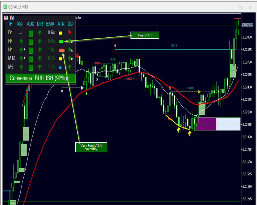 • Filters noise with strict consensus and volatility (ATR)