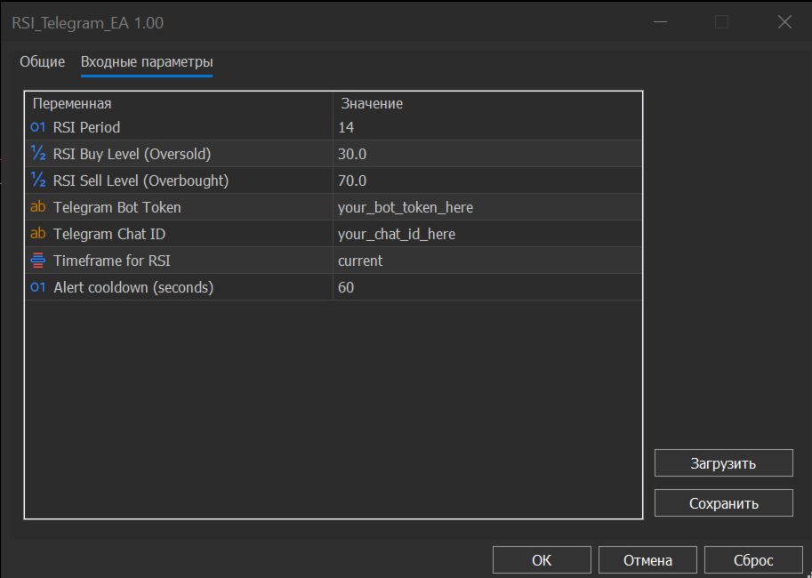 The settings are intuitive and beginner-friendly. You simply enter your Telegram Bot Token, Chat ID, desired RSI levels, and update frequency. The interface is clean and minimalistic, with clear parameter descriptions to make configuration effortless.