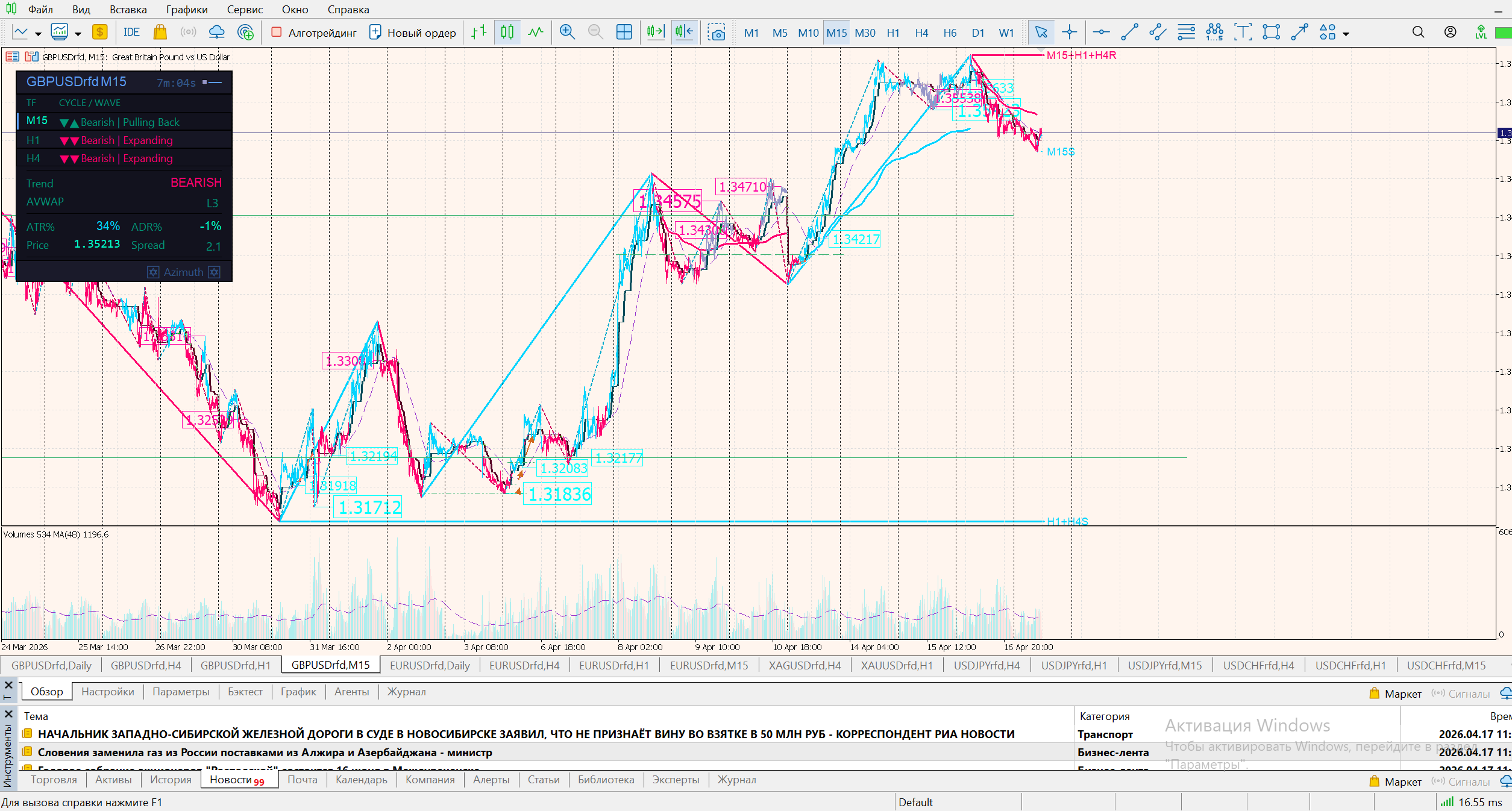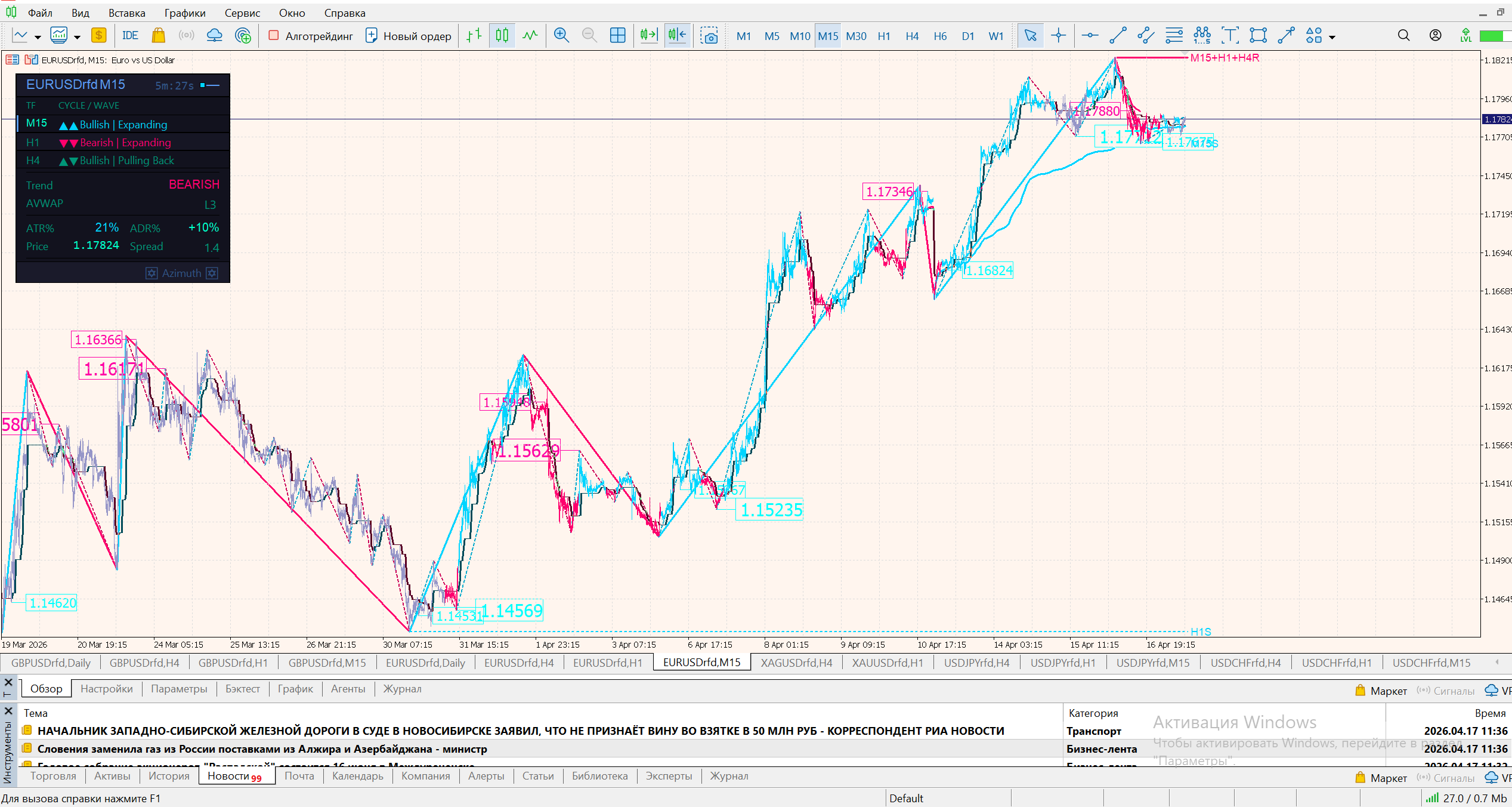 Спасибо за подробный ответ. Понял, что H4 в панели и на графике это не одно и тоже. Правильно ли я понимаю, что при любых временных настройках используется еще четвертая составляющая? В моем случае Level4 - Это D1 верно? И можно ли поподробнее узнать, как рассчитывается строка H4 в панели? Потому что к моему стыду я к сожалению так и не понял, почему на двух практически одинаковых графиках(графики в первом моем сообщении) с практически одинаковой волновой структурой на H4. на H1 и даже на D1, значение строки H4 в панели разная. Возможно я слишком настойчив, простите меня за это. С уважением , Дмитрий.