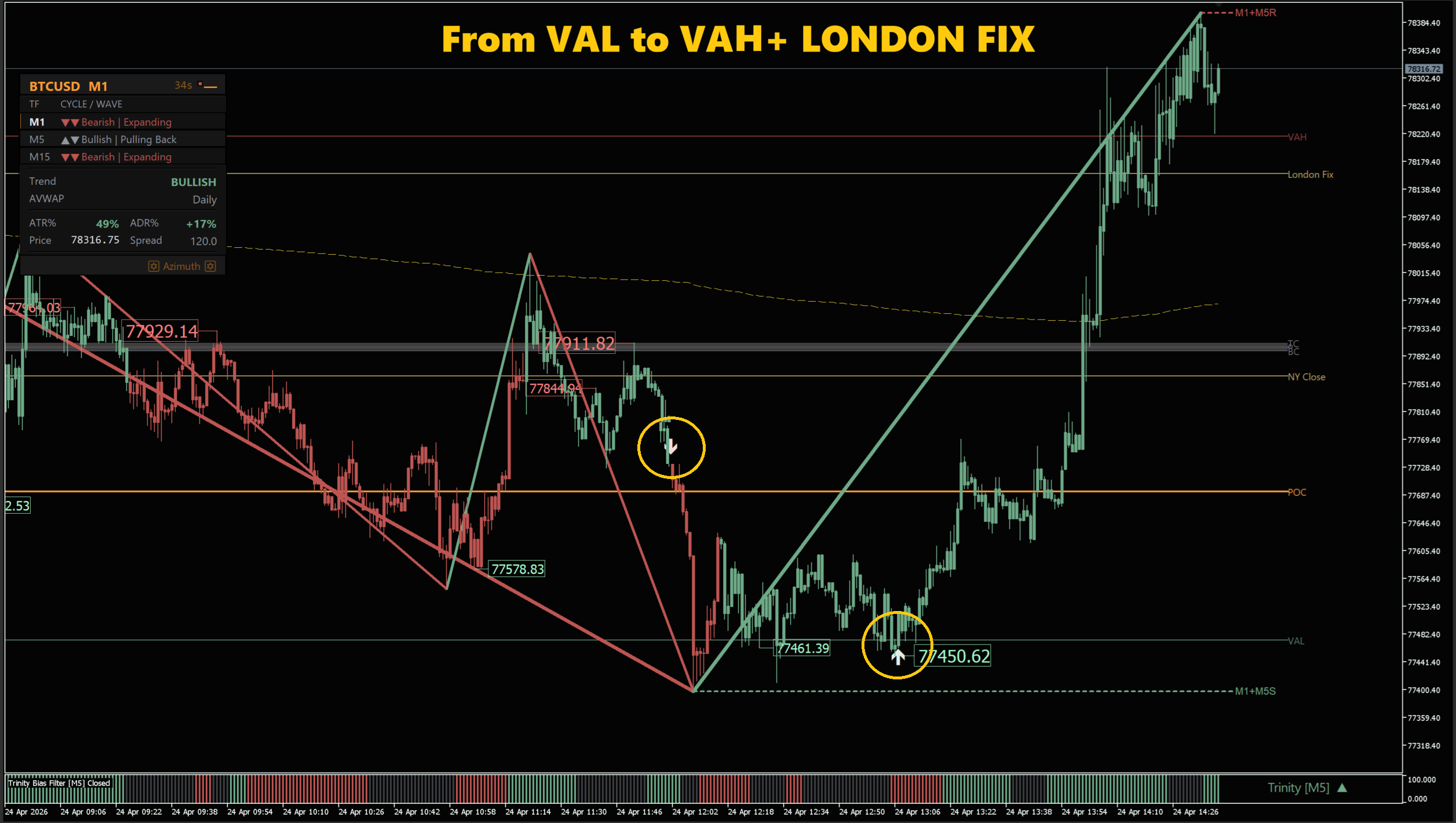 3. В Free-версии нет автоматического индикатора “++”, поэтому alignment нужно читать прямо по трем строкам панели. Самая чистая ситуация — когда все три строки направлены в одну сторону и внутренне согласованы, например Bullish | Expanding на M5, M15 и H1, либо Bearish | Expanding на всех трех. Если одна или несколько строк находятся в состоянии Pulling Back, общий bias может оставаться тем же, но это уже не полное alignment, а коррекция внутри структуры.