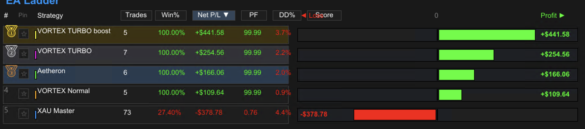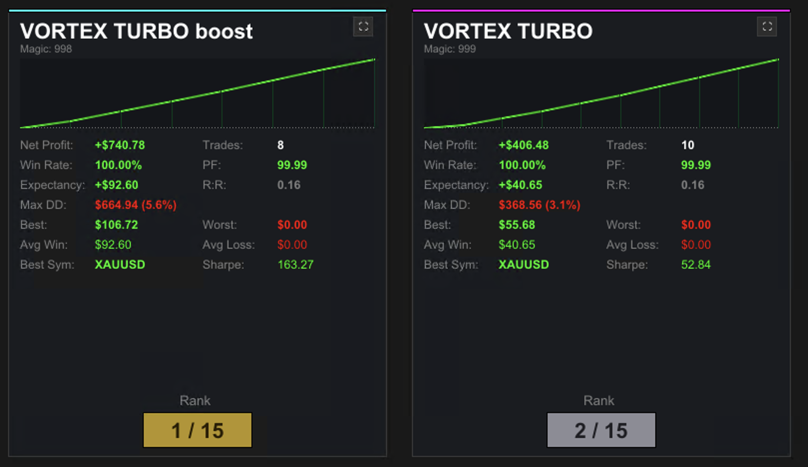 The Vortex Turbo in 3 different settting, Normal, High, Boost, delivered in 18 days on 8 days positive results (10k demo live), no loss day. Thank you for this excellent development.